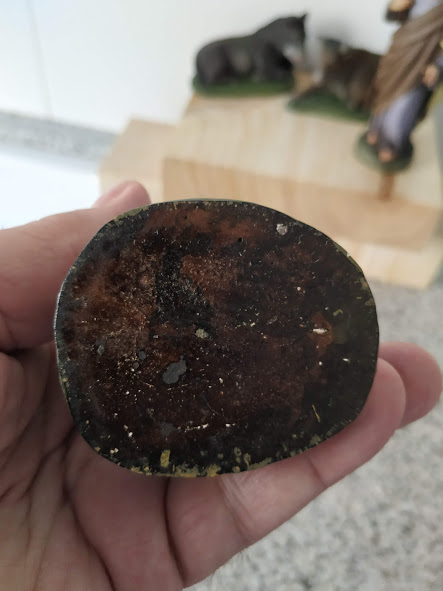 También podría ser un repintado malo, aunque sigo viendo esas características típicas de la pátina con ese brillo, los colores y hasta esos ojos de estas figuras...aquí un nacimiento: