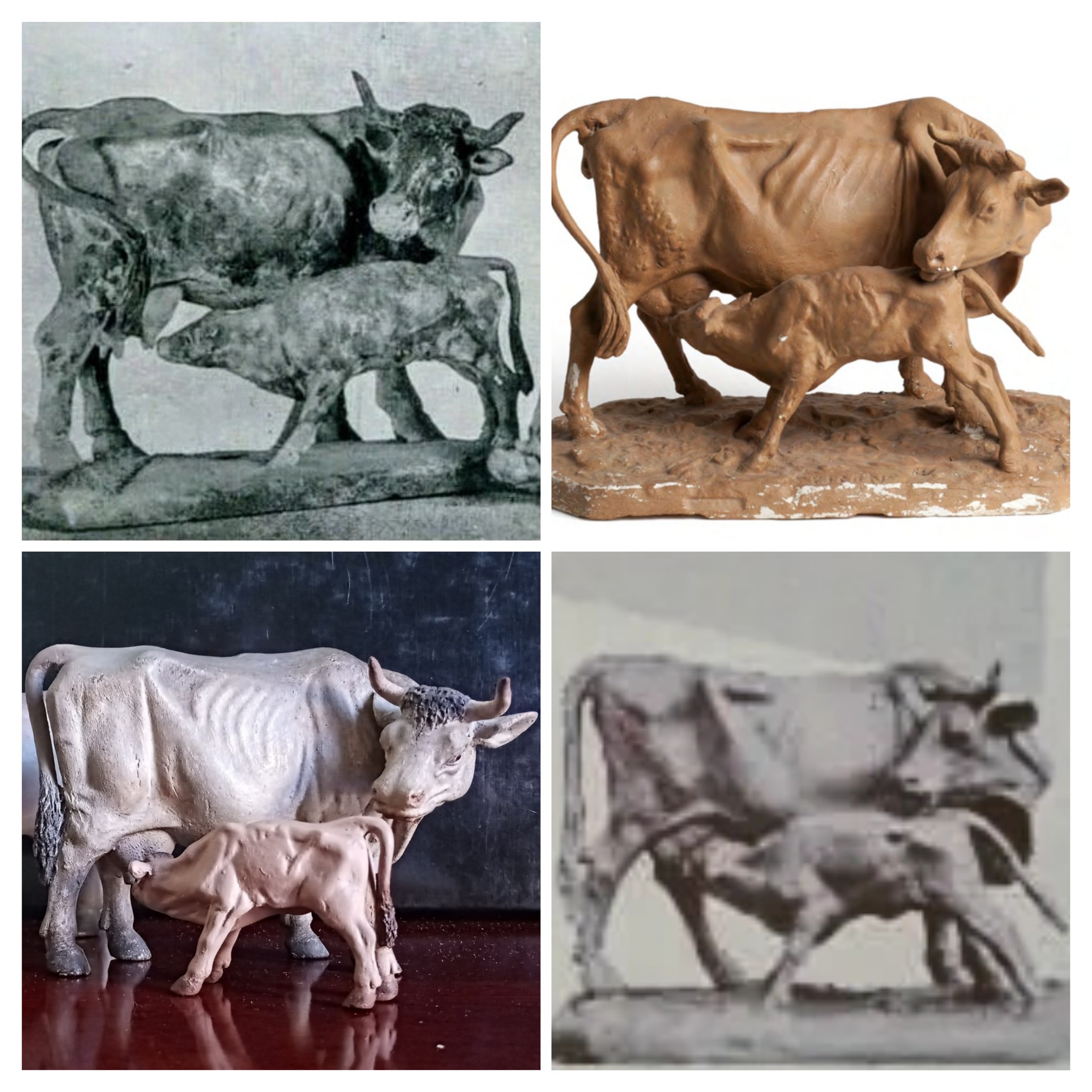 Curiosamente, la cronología nunca me había cuadrado del todo. Siempre me resultó difícil aceptar que la figura de Vaca y ternero producida en el taller olotino fuera simplemente una copia directa de Masdéu. Sin embargo, al revisar la imagen del catálogo de los años 30, se confirma que esta versión coincide casi exactamente con el molde original de Pierre-Jules Mêne.
