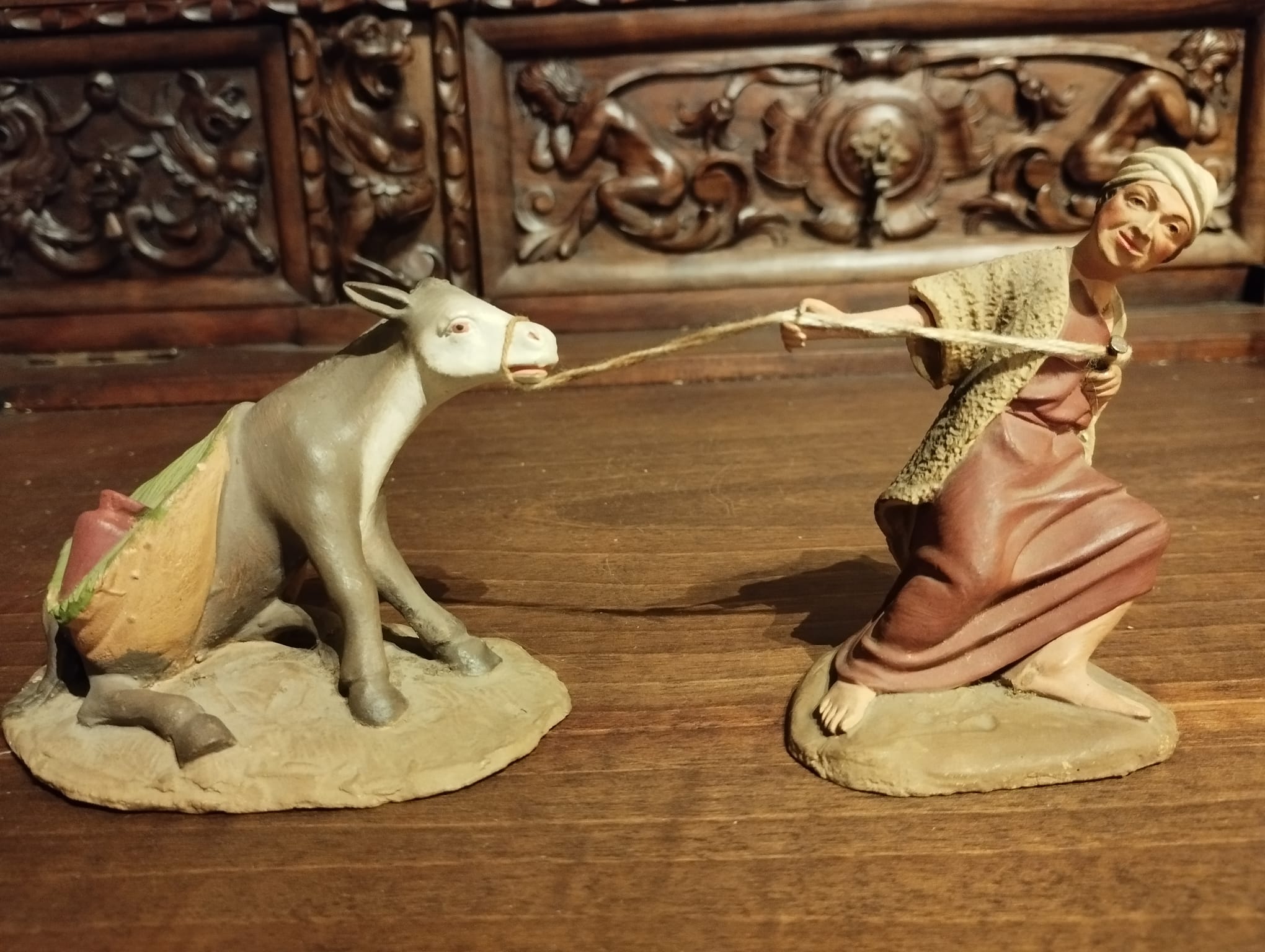 Un grupo de figuras de 20cms., una de las últimas adquisiciones del Avi, destaca por su singularidad. El personaje del belén conocido como "el niño a hombros" en la saga Castells tiene su origen en la figura de la Virgen con el niño Jesús a hombros , inspirada en una ilustración de William Hole. Antes que Martí Castells, su padre ya la había incorporado como figura de belén.