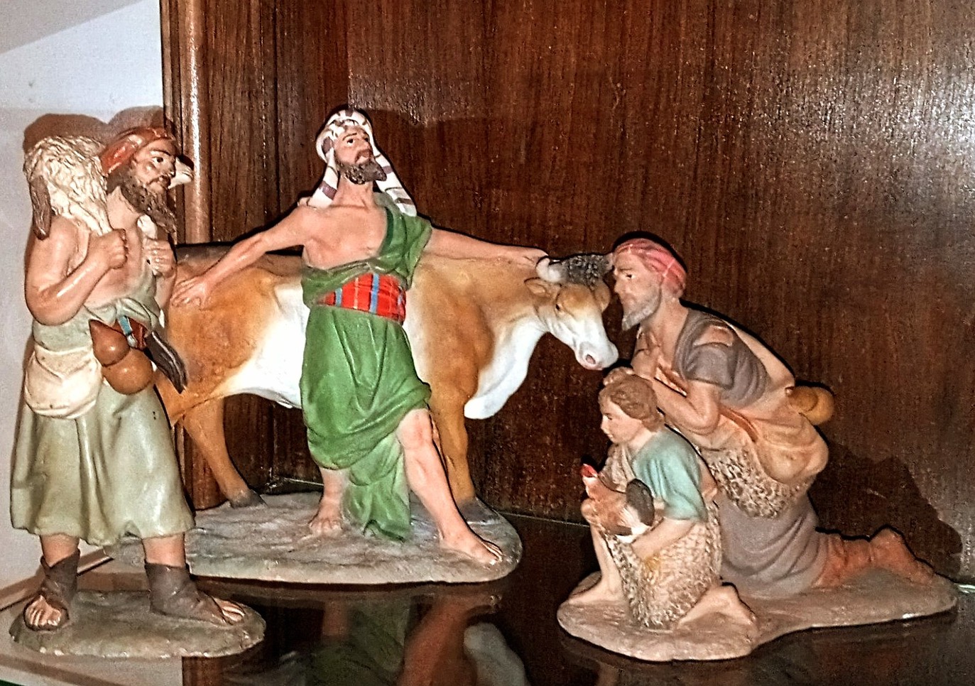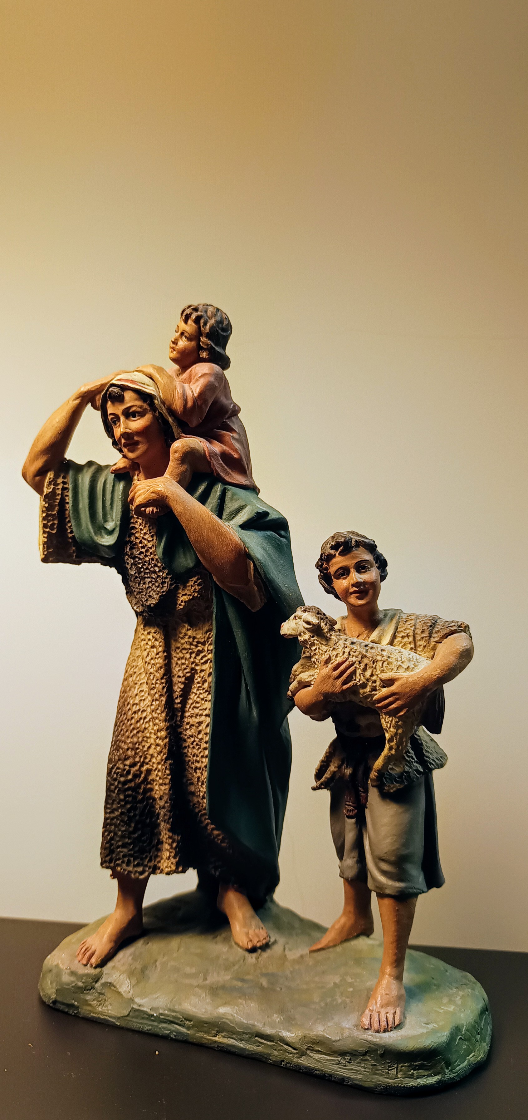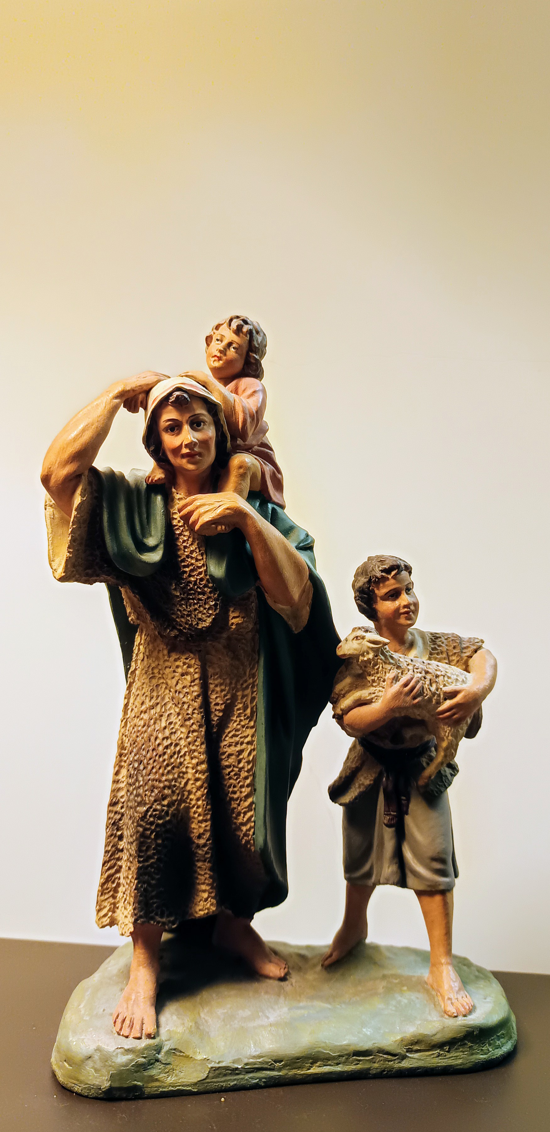 Un grupo de figuras de 20cms., una de las últimas adquisiciones del Avi, destaca por su singularidad. El personaje del belén conocido como "el niño a hombros" en la saga Castells tiene su origen en la figura de la Virgen con el niño Jesús a hombros , inspirada en una ilustración de William Hole. Antes que Martí Castells, su padre ya la había incorporado como figura de belén.