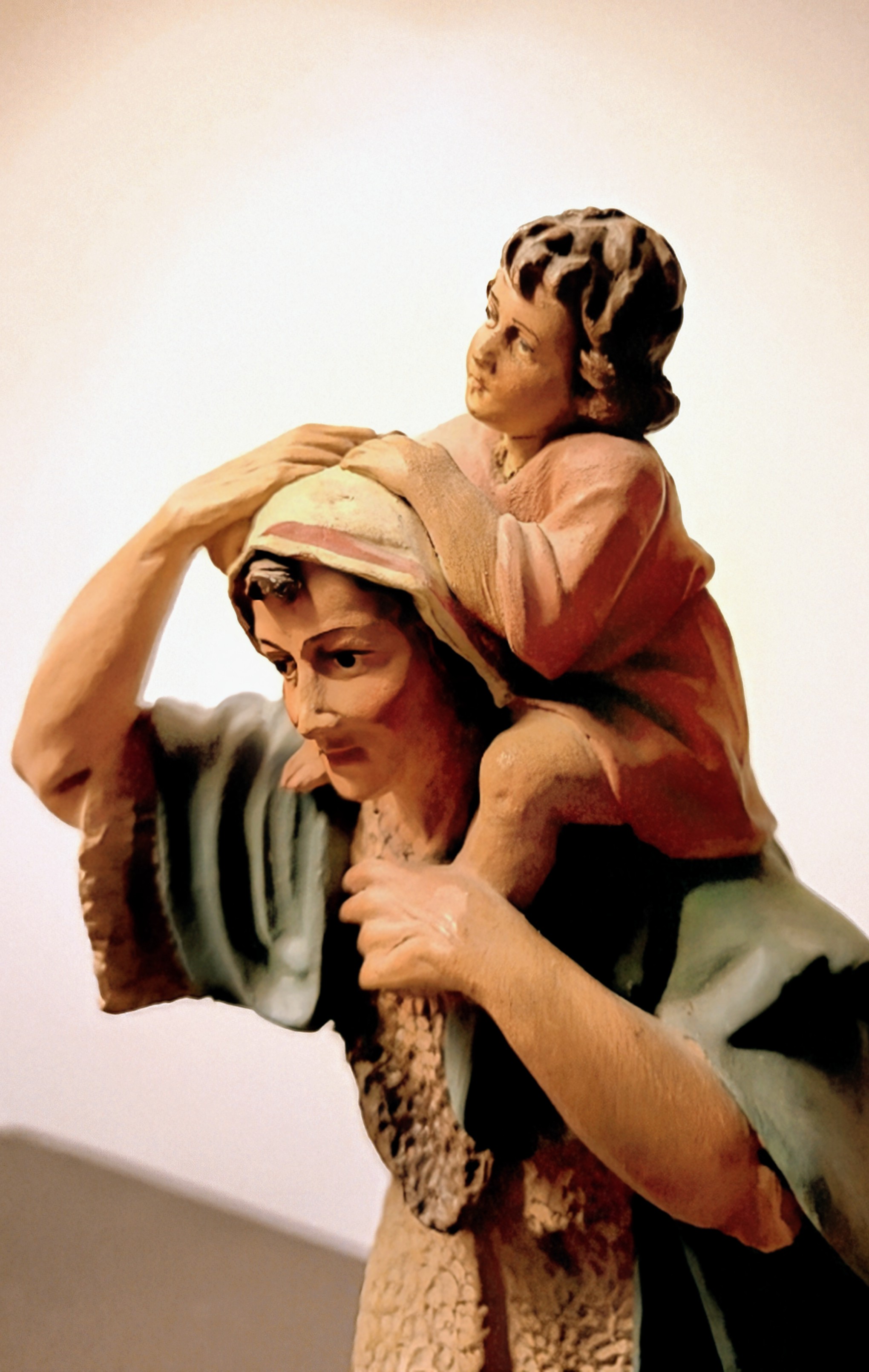 Un grupo de figuras de 20cms., una de las últimas adquisiciones del Avi, destaca por su singularidad. El personaje del belén conocido como "el niño a hombros" en la saga Castells tiene su origen en la figura de la Virgen con el niño Jesús a hombros , inspirada en una ilustración de William Hole. Antes que Martí Castells, su padre ya la había incorporado como figura de belén.