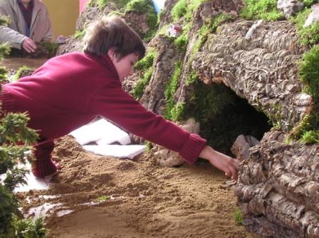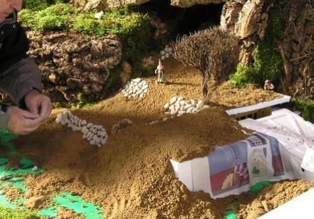 Hay tres tipos de arena que, en mi opinión, son las más idóneas para la confección de este tipo de belenes; en primer lugar la llamada arena de miga , este tipo de arena (que está mezclada con arcilla) resulta interesante por su color - de amarillento a ocre claro - y por su textura - es más compacta, se deshace bien y se puede cribar para conseguir afinarla -, por lo que es idónea para la confección de caminos y explanadas; por otro lado tenemos la denominada arena de río que, como su nombre indica es la arena que se origina por la erosión de las piedras rodadas de un río, para entendernos sería algo así como cantos rodados microscópicos, por lo que está muy indicada para el lecho y orillas del río; por último, tenemos la arena de playa , que es la mejor para simular zonas desérticas o, porqué no, zonas de alrededor de lagos o mares, aunque también se puede utilizar la arena de miga muy cribada. También se pueden conseguir buenos resultados con mezcla de las distintas arenas.