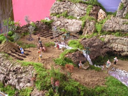 Las miensiones, pues son casi 49 m2, el belén tiene una forma de U no muy uniforme por las dimensiones particulares del local donde se monta, pero ponle para hacerte una idea que tiene, si lo conviertes en un rectángulo: 12 metros de largo x 4 metros de ancho x 2 de alto (la zona donde se sitúa el castillo es la mas alta, desde el nivel del suelo serían 1 m de plataforma + 2 metros de desnivel de montaña)