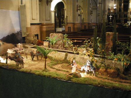 Adjunto algunas fotos con el resultado final. No son muy buenas por falta de luz, pero creo que se puede ver el final del trabajo. Como curiosidades, podéis ver que los fondos son fotografías de la plaza mayor y la calle Montaña que es la entrada a la plaza, en el caso de la iglesia, y de una panorámica de Algemesí en el caso de la muy querida por todos los Algemesinenses, Calle Berca. Para la construcción de las casas de esta popular calle (es por donde discurre la "procesoneta del matí" el 8 de Septiembre, fiesta de la "Mare de Deu de la Salut" pongo enlace para los que quieran conocer más sobre este otro asunto http://www.algemesi.net/Default.asp?DocID=1156 ) se han utilizado fotografías reales de las casas y se han pegado sobre las diferentes casas de cartón que se han realizado. Tambíen se pueden ver la pared de "Pardines" y la pared de "Cotes", antiguos asentamientos de los cuales solo queda lo que se ve, las dos paredes y donde se ha situado la Anunciación a los pastores. También hay un tramo de la "Acequia Real del Jucar" y como no, la vegetación es autóctona, con naranjos como árbol principal.