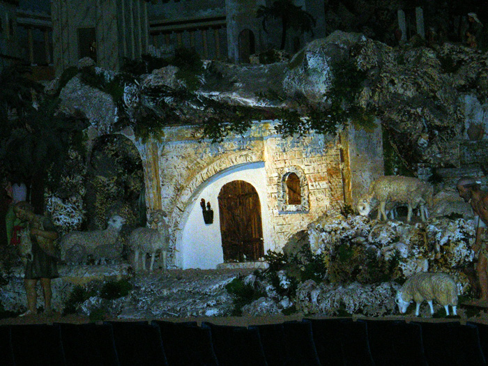 La cueva o construcción donde se encuentra la sagrada familia, no aparece al principio del visionado al estar tapada por una pared de “una casa”. En el momento conveniente esta pared “desaparece” y se enciende el Nacimiento en todo su esplendor. Ver el Nacimiento de Mayo, bien conocido en: