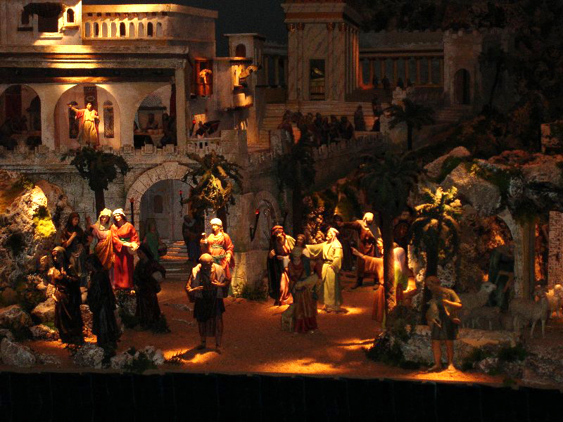 Es Mª Magdalena quién piensa en voz alta toda la historia de la Salvación iniciando el relato desde la expulsión del Paraíso terrenal, el anuncio del Salvador, su nacimiento, lo que hizo en su vida pública, su crucifixión y su resurrección, pasando de un lado a otro del Belén utilizando la técnica de iluminación de escenas específicas, que ya hemos explicado en este Foro y la colocación de escenificaciones parciales mediante ascensores que suben determinados grupos de figuras, antes de abrir un foco que, en aquel momento, está iluminando fuertemente otra escena.