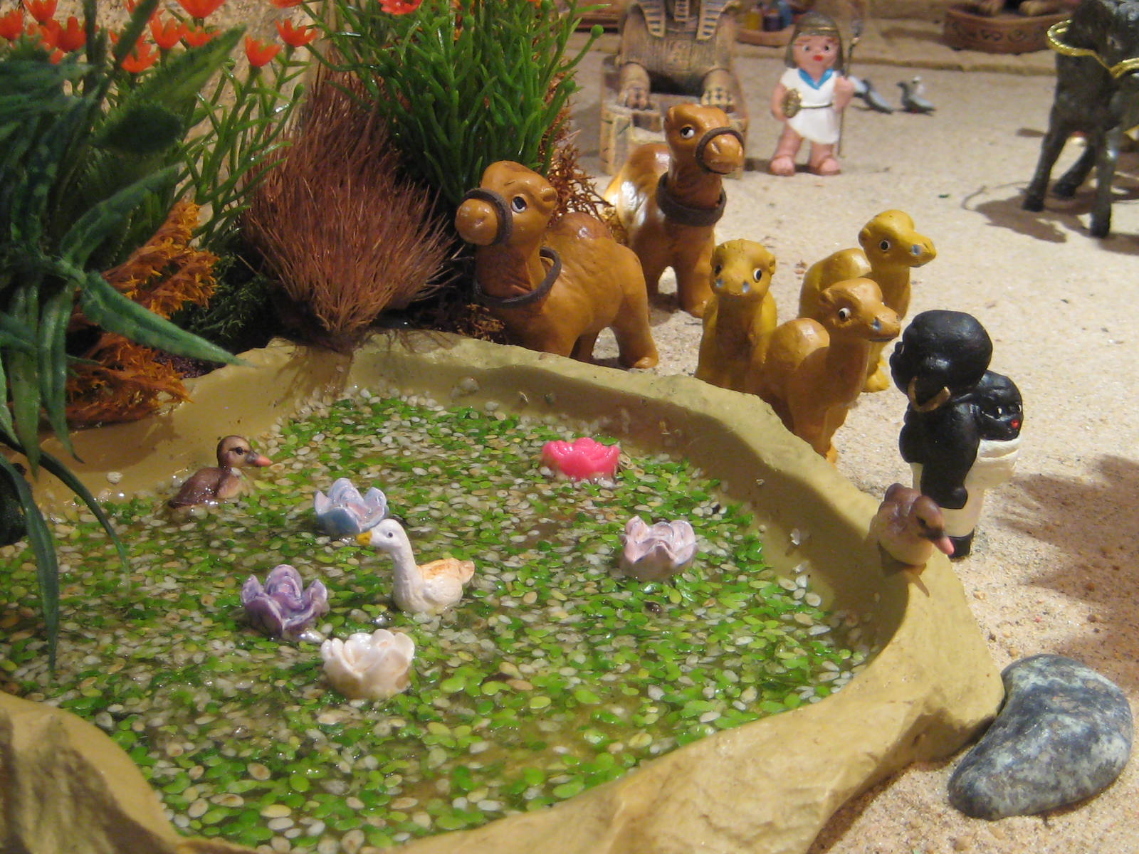 Asi me he quedado Pilita, que preciosidad de belén, es que me gusta todo, todo, tienes multitud de escenas, muy trabajadas y bien hechas; he visto como ibas haciendo algunas de las escenas pero así en conjunto lucen de maravilla. Me encanta el puesto de chuches, la calle y sus figuras, la escena de los niños jugando es encantadora, la jaima te ha quedado soberbia, el lago precioso así como el riachuelo y la fuente con agua que parece real, y el palacio con todas las huries fantástico y de todo, lo que más me ha gustado y que no había visto con anterioridad toda la escena de Egipto, es insuperable, fantásticas las figuras, las estatuas,la huida, etccc..