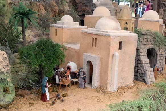 Desde hace nueve años, el belenista Fernando Benítez es el encargado de recrear esta tradición en una superficie que ocupa un perímetro de 40 metros y que ha sido colocada a la altura de los más pequeños. A diferencia de otros belenes que recrean el paisaje local, el Parque San Telmo luce un Belén hebreo en el que se escenifican paisajes de la tierra de Nazaret y Belén. Para ello, se utilizan construcciones de la edad de Jesucristo recreando tanto las casas de techos abovedado de la época como sus paisajes montañosos y rocosos.