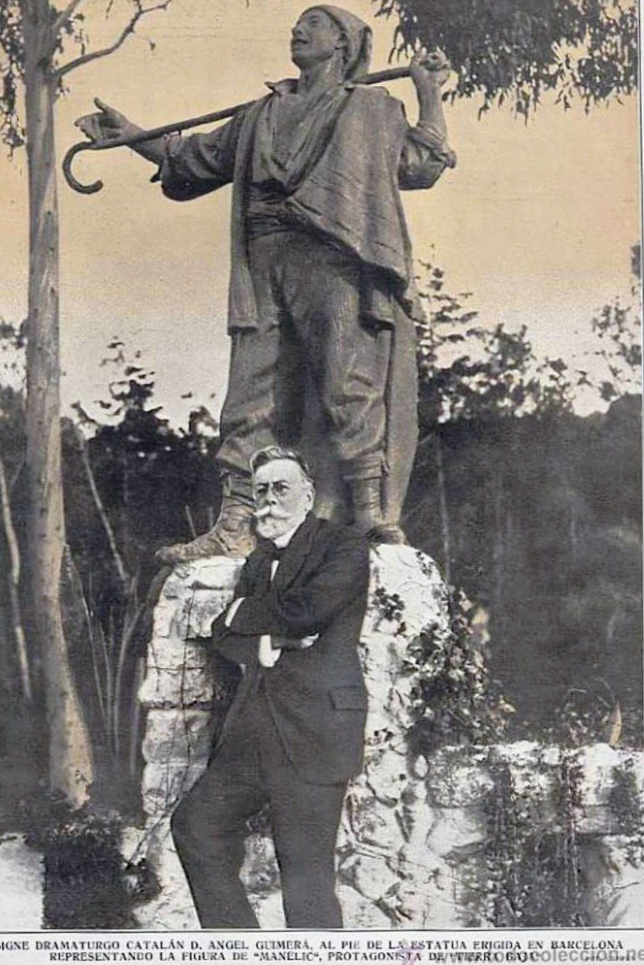 "Por cierto la hermosa escultura del Manelic que está situada en el Jardí de les Escultures, al lado de la Fundació Miró en Montjuïc es obra del escultor Josep Monserrat i Portella (Barcelona 1860-1923) y fue inaugurada el año 1909 con ocasión del homenage a Ángel Guimerà. La figura representa a Manelic personaje de la obra teatral Terra Baixa y el modelo va a ser el actor Enric Borràs...."