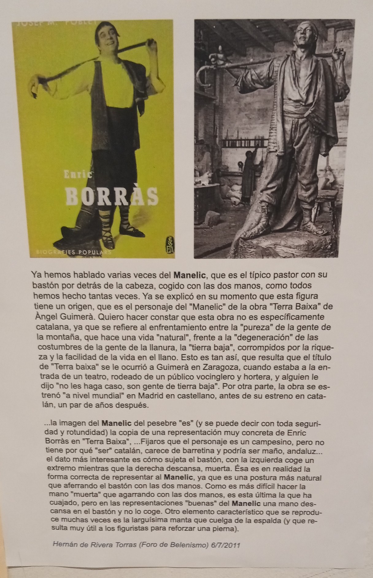 "Ya hemos hablado varias veces del Manelic, que es el típico pastor con su bastón por detrás de la cabeza, cogido con las dos manos, como todos hemos hecho tantas veces. Ya se explicó en su momento que esta figura tiene un origen, que es el personaje del "Manelic" de la obra "Terra Baixa" de Àngel Guimerà. Quiero hacer constar que esta obra no es específicamente catalana, ya que se refiere al enfrentamiento entre la "pureza" de la gente de la montaña, que hace una vida "natural", frente a la "degeneración" de las costumbres de la gente de la llanura, la "tierra baja", corrompidos por la riqueza y la facilidad de la vida en el llano. Esto es tan así, que resulta que el título de "Terra baixa" se le ocurrió a Guimerà en Zaragoza, cuando estaba a la entrada de un teatro, rodeado de un público vocinglero y hortera, y alguien le dijo "no les haga caso, son gente de tierra baja". Por otra parte, la obra se estrenó "a nivel mundial" en Madrid en castellano, antes de su estreno en catalán, un par de años después.