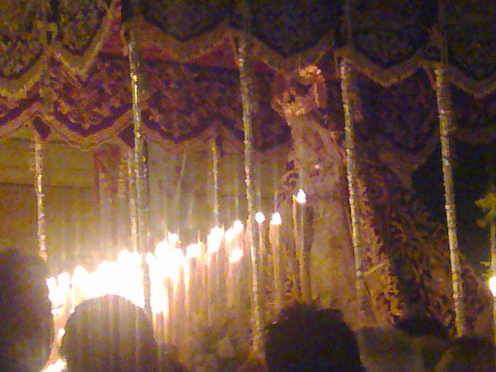 Sí, Andrés, yo también estuve cerca, muy cerca, de vuestra Virgen de Regla Coronada y puedo atestiguar que la piedad y el respeto alrededor, eran muy distintas de las procesiones de Semana Santa en Madrid, donde un cierto folklorismo está siempre presente. Por ejemplo, 150 m recorridos, 3 paradas, costaleros sudando la gota gorda y el público 3 veces entonando motu propio Virgen Santa/ Virgen pura/ vida, esperanza y dulzura… en ti confío…ponía los pelos de punta, insólito en Madrid. Daba gusto ver pasar los distintos pasos. Pero nuestra Roldana , destacaba entre todos. Hice una foto, que perdonar por su mala calidad, pero quería temer un recuerdo cercano .