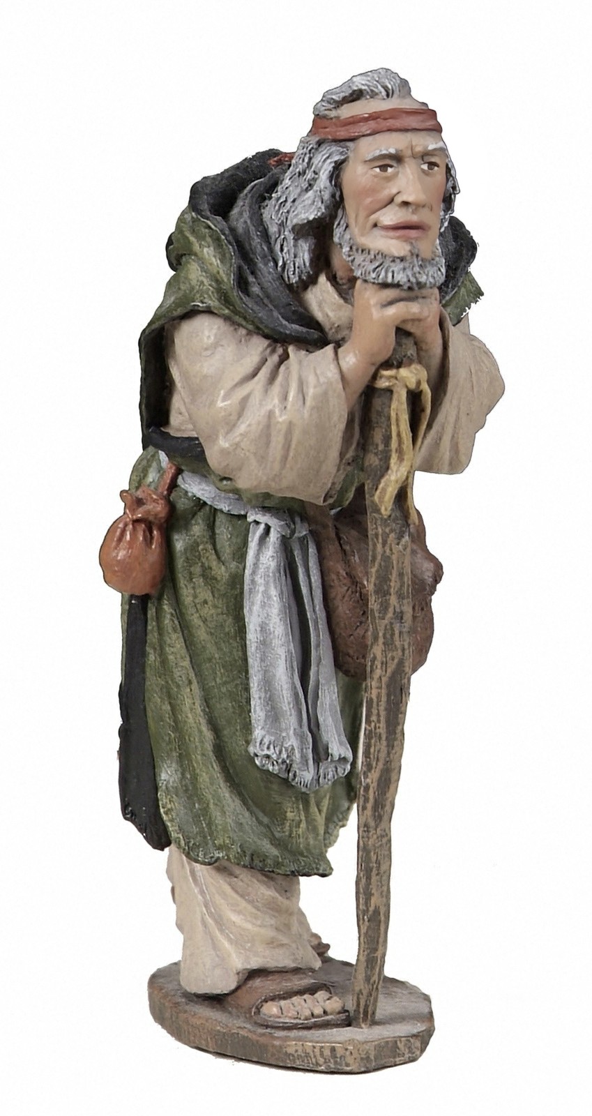 El pastor . Aparte de todos los pastores que van 'de camino' hacia Belén para adorar al Mesías, figura en el pesebre el pastor que guarda el ganado, representado por un pastor que a veces lleva capucha y zamarra, sobre la que le cuelga el zurrón, que también quiere ser de lana, y otros llevan sombrero y va envuelto con capote. Lleva cayado en sus manos y está en actitud rígida, más propia para hacerse retratar que para vigilar al rebaño. Es remarcable que ambas figuras responden aproximadamente a la indumentaria cierta de los pastores, y creemos de buen sentido suponer que la creación de estas dos figuras no es barcelonesa, porque en ciudad tenemos un concepto diferente al modo de vestir de los pastores. El pastor apretado con sombrero y cubierto con capote es propio de los figuraires olotenses y recuerda una indumentaria pastoral hoy caída en desuso, pero real y que también encontramos figurada en la imaginería impresa. El pastor de la zamarra, al tomar carta de naturaleza entre los figuraires barceloneses, ha perdido un notable detalle pastoral: tal es el de aplicarle una vara (o bastón) en lugar del cayado o tirapié, la herramienta típica que emplean los pastores para coger las ovejas por el muslo, muy parecido a una vara y que utilizan de bastón, pero no lo es.