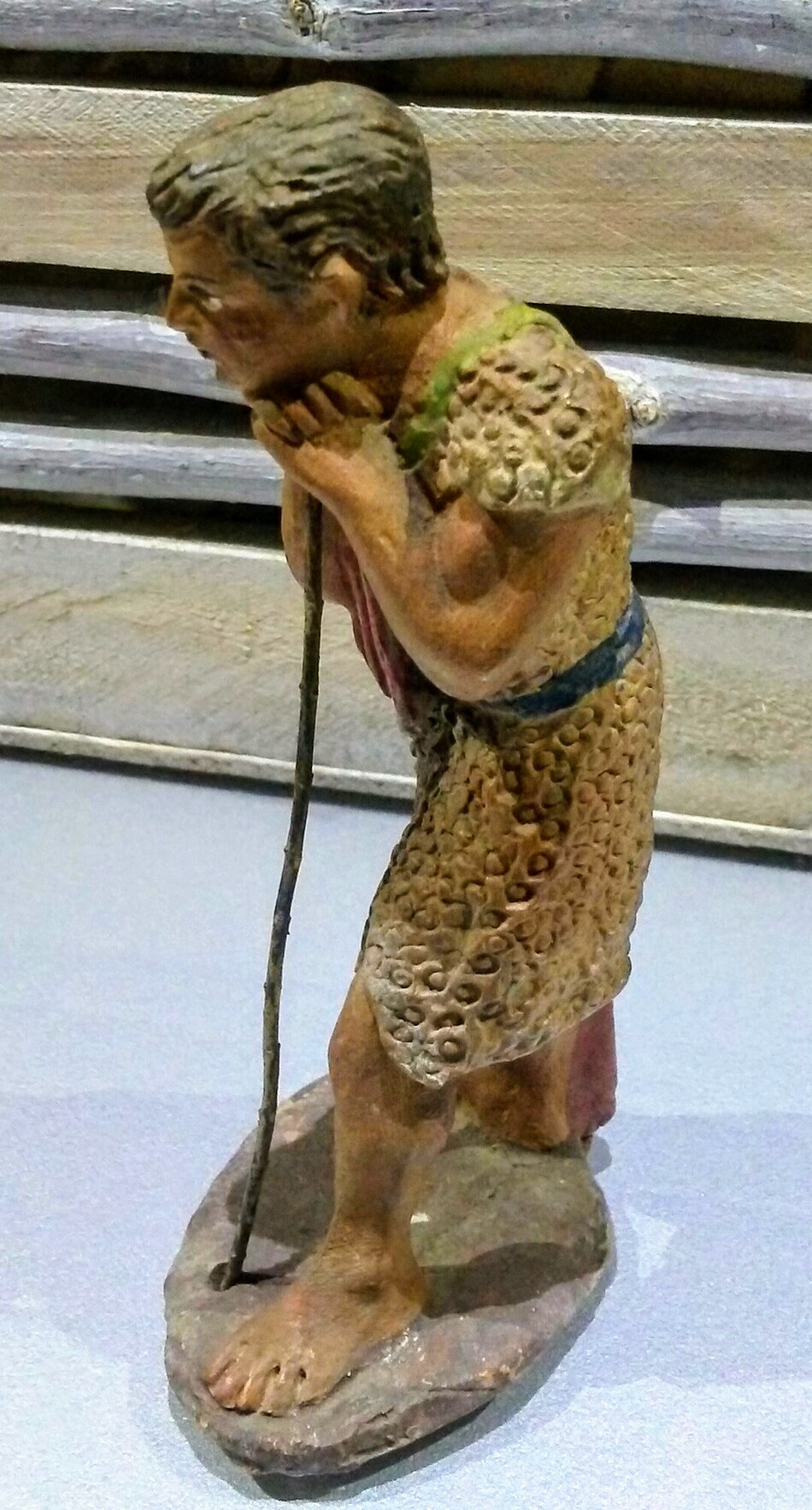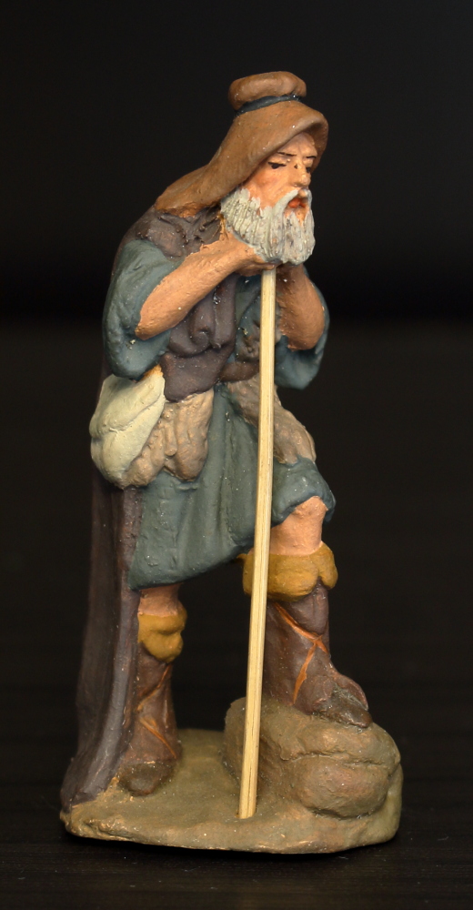 Aquí la representación, como en el pastor 'Manelic', es primordial. El dato interesante es cómo se apoya en el bastón (vara, cayado), con las dos manos, una encima de la otra, y, a su vez, sobre estas, el mentón. Esta postura es, en realidad, la forma correcta de expresar la dualidad entre la vigilancia del ganado y el ensimismo en el paisaje. Esto me recuerda el homenaje a la figura de belén de estas pasadas Navidades, relacionándolo con obras de arte profanas pero muy simbólicas.