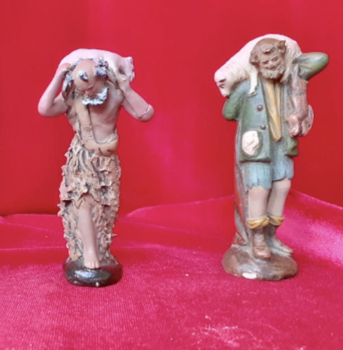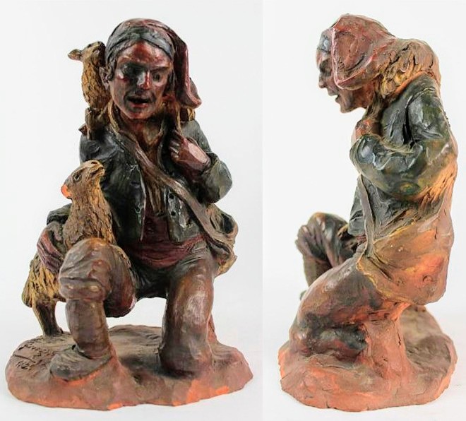 Al ver la figura me viene a la cabeza contar un `cuento´(bueno ya veremos, todavía se debe...), antes una referencia pictórica relacionada con la impresión del estilo popular y "napolitano" de sus vestimentas, pose y expresión...por adelantar parece más un cazador en la campiña napolitana que un ¡Buen pastor!...