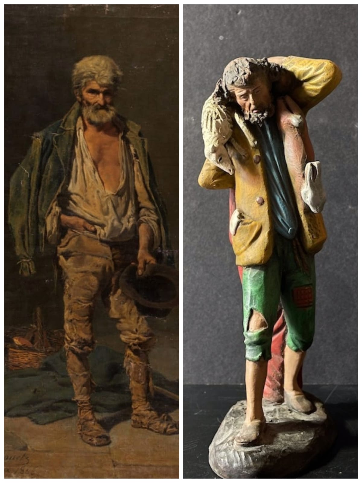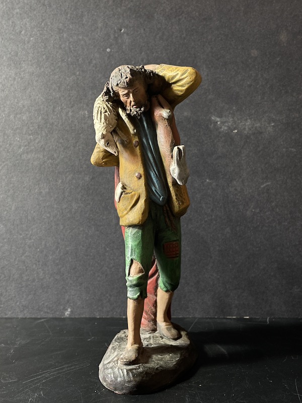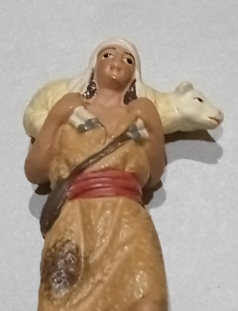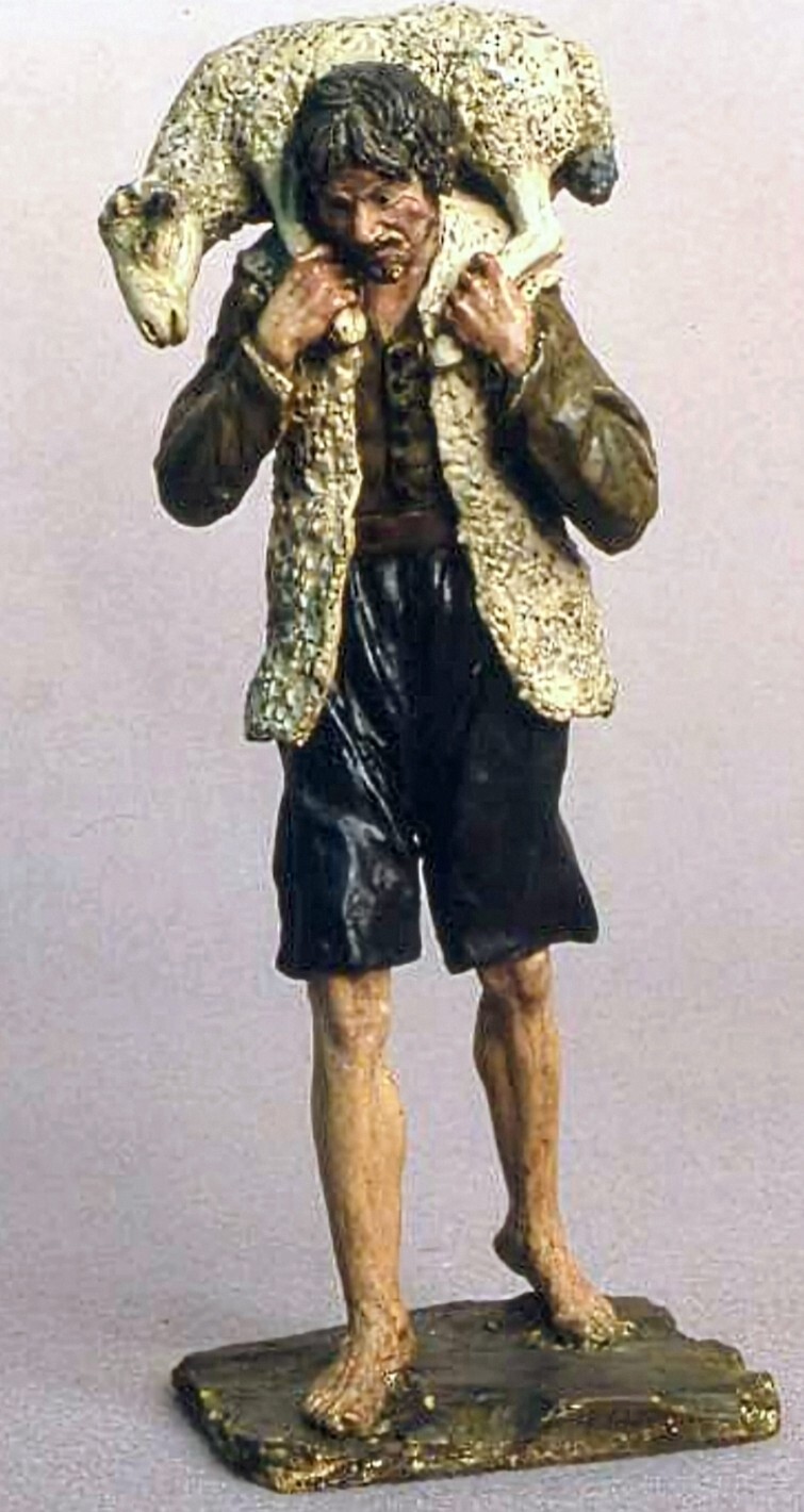 Al ver la figura me viene a la cabeza contar un `cuento´(bueno ya veremos, todavía se debe...), antes una referencia pictórica relacionada con la impresión del estilo popular y "napolitano" de sus vestimentas, pose y expresión...por adelantar parece más un cazador en la campiña napolitana que un ¡Buen pastor!...