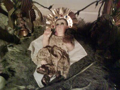 Les pongo una foto  de mi "Chico" que me fue heredado por mi abuela hace 20 años. Es una talla de madera, perteneciente al barroco tardío Guatemalteco, fue reconstruído por haber sido roto en los 1850 y originalmente tenía el  brazo retorcido derecho sobre el estomago, pero debido a la usanza moderna se le modificó el brazo  a extendido, todo lo sé por que lo restauré hace 10 años en el museo de arqueología de guatemala y le tomaron rayos x. Mide 30 cm. de pies a cabeza, Es muy consentido y lo apreciamos mucho.