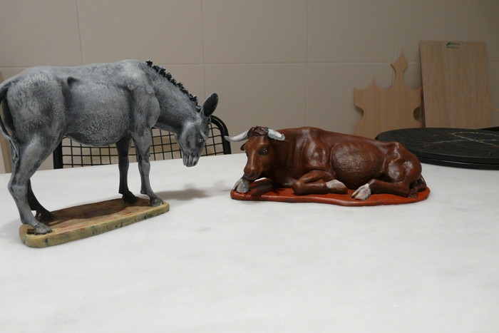 Bueno, pues aquí están la mula y el buey, que gracias al video de Lola se pintan en un momento y con la base giratoria esta de los chinos es mucho más fácil. Espero que os gusten.