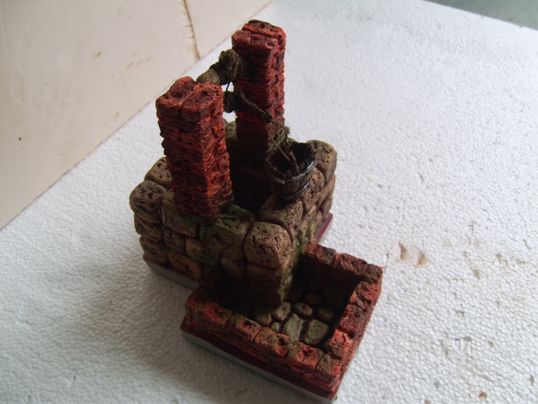 Hola amigos belenistas. Aquí os presento éste mi primer pozo que con toda ilusión ubicaré en el belén, ya tan próximo. En las fotos 1 y 2 se puede apreciar que los elementos del pozo los saqué de plancha de pórex estrusionado de 3 cm. de grosor, y las diversas herramientas que necesité. En la foto 3 indico que usé pintura de base rojo inglés y también pintura de caucho líquida para impermeabilizar el abrevadero, ya que este llevará agua. Como se aprecia, las dos pinturas son indistinguibles, con lo que se consigue uniformidad. En la foto 4 se percibe ya la pintura final, tanto de piedras como de ladrillos, conseguida a base de veladuras y pincel seco. En las restantes fotos se ve el resultado final, tras el pegado de las piezas y el aditamento de los complementos: polea, cubo, cuerdas...