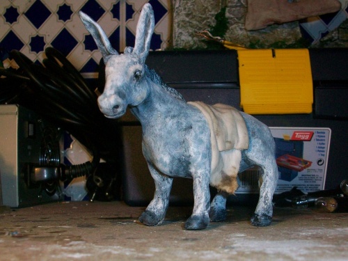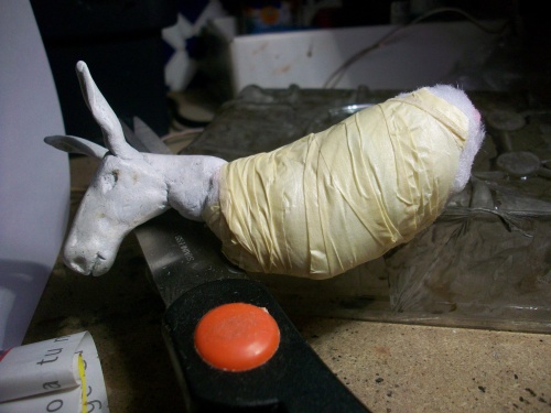 Necesitaba una burrita y he empezado modelando una cabeza en pasta, un mini-esqueleto de alambre y ....ahí viene la novedad, para ahorrar en pasta de modelar y peso, le he dado volumen con guata sintética envuelta muy apretada con cinta de carrocero. Ahora hay que iniciar el modelado sobre este material, veremos como reacciona.