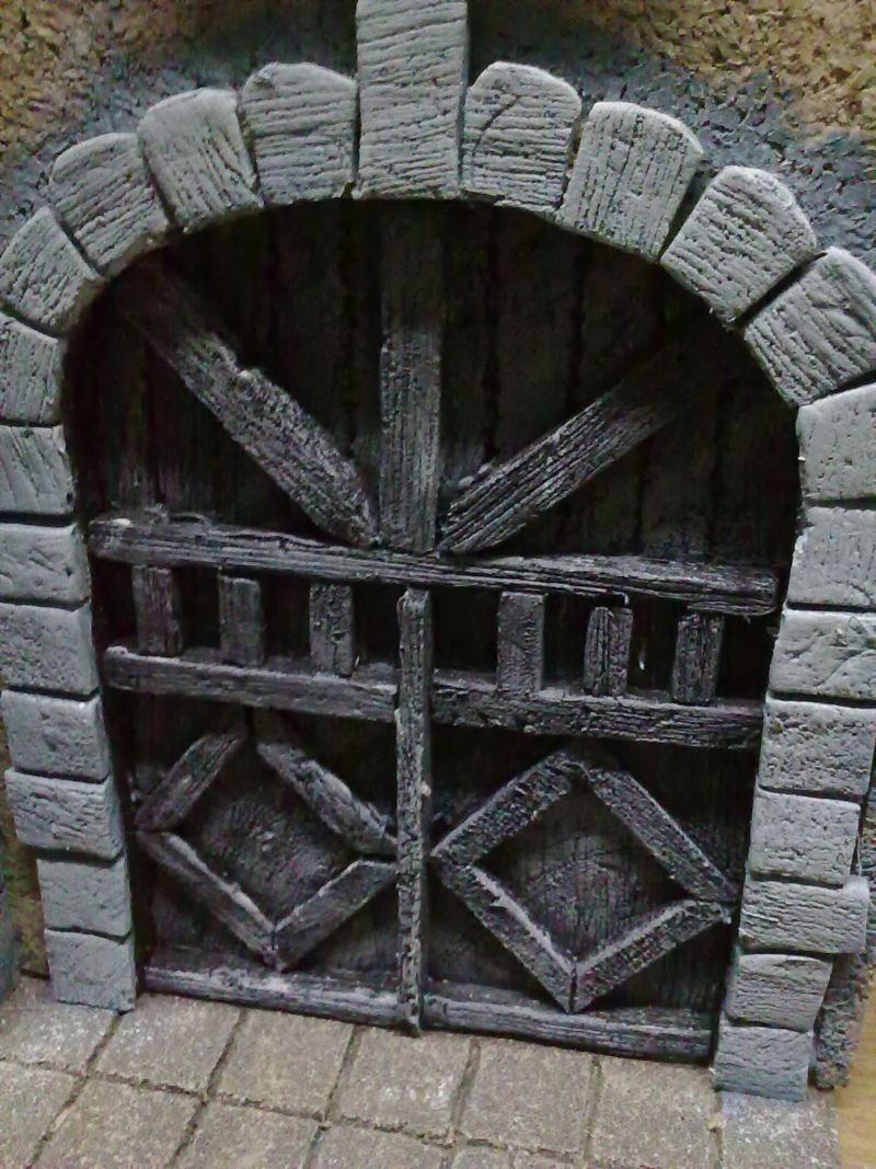 1) La puerta, ¿cómo se abre? Parece que se trata de una puerta de arco con dos hojas (que se abriera en dos, cada hoja con sus goznes en la pared) pero tal y como está configurada no lo veo. Conste que seré yo, que no lo veo.