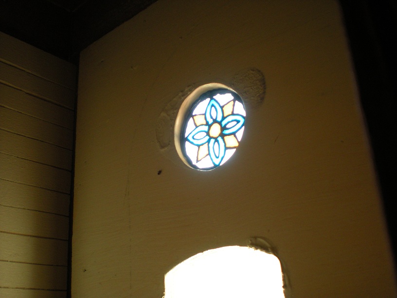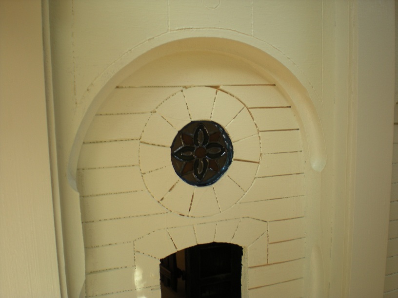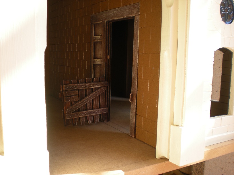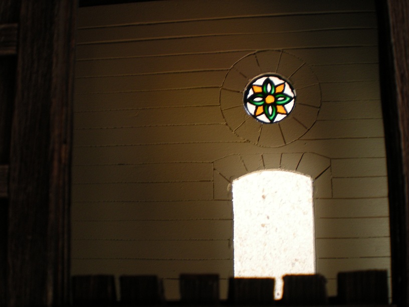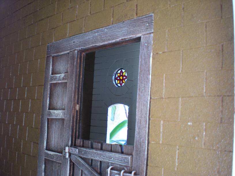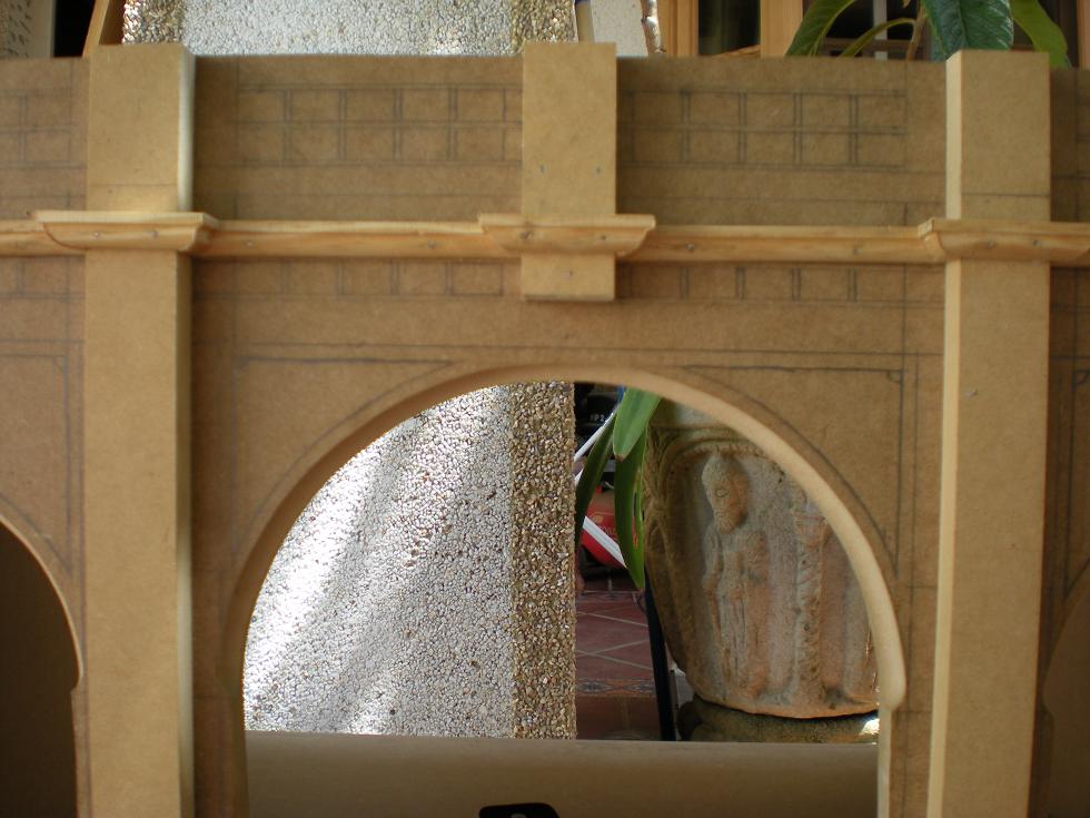 Mas fotos. La parte baja de la cornisa de la fachada ya está terminada. Ahora queda la parte superior. Por otro lado, ya he cerrado también uno de los laterales. En las ventanas y los rosetones quiere poner vidrieras, y las haré con trozos de metacrilato pintados con laca de bombillas.