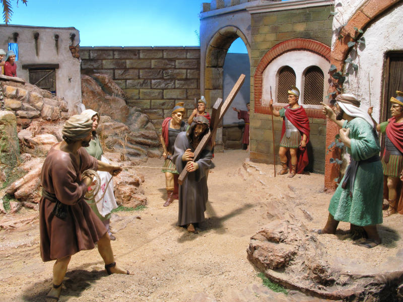 Gran escena del "Camino del Calvario" con figuras de Olot en 30 cm, realizada por Diego Alarcón y Vicente Bañó para la exposición "JESÚS EL CRISTO" de la Asociación de Belenistas de Alicante.