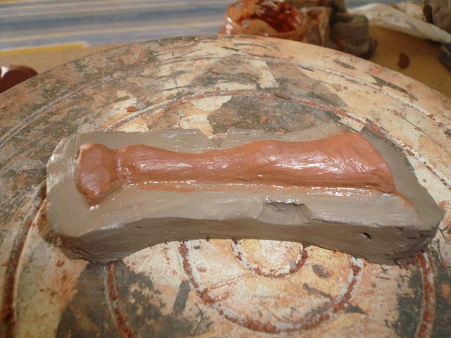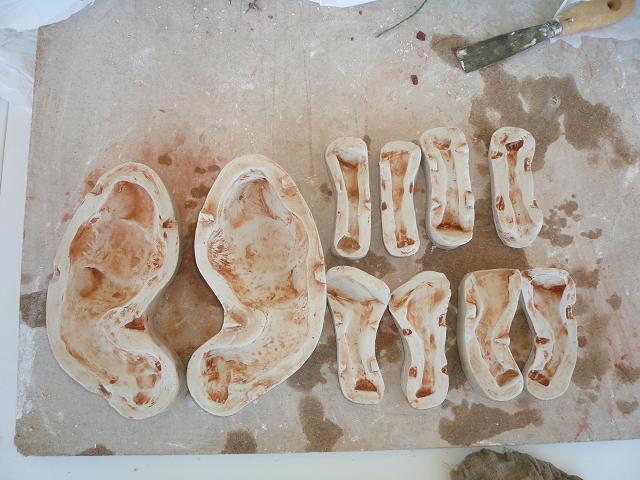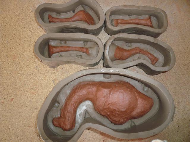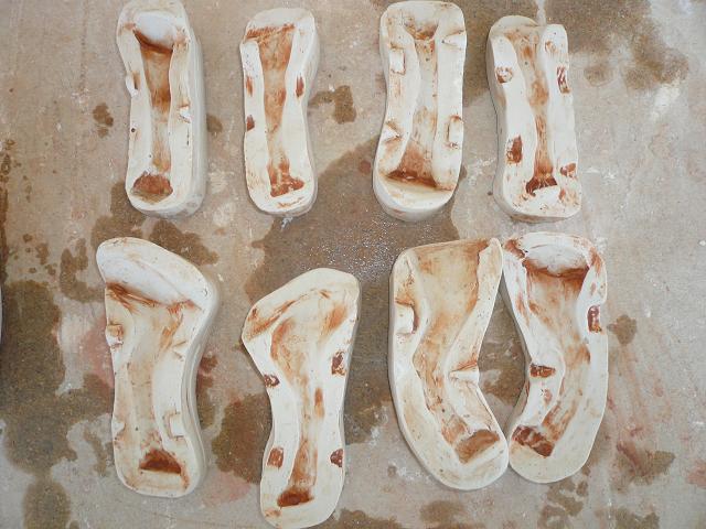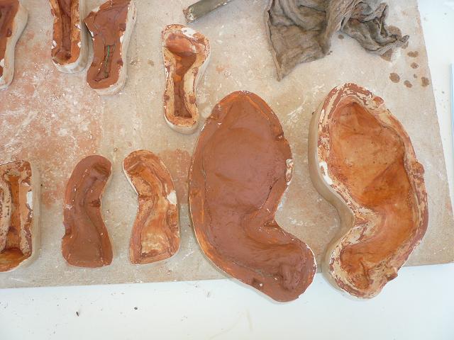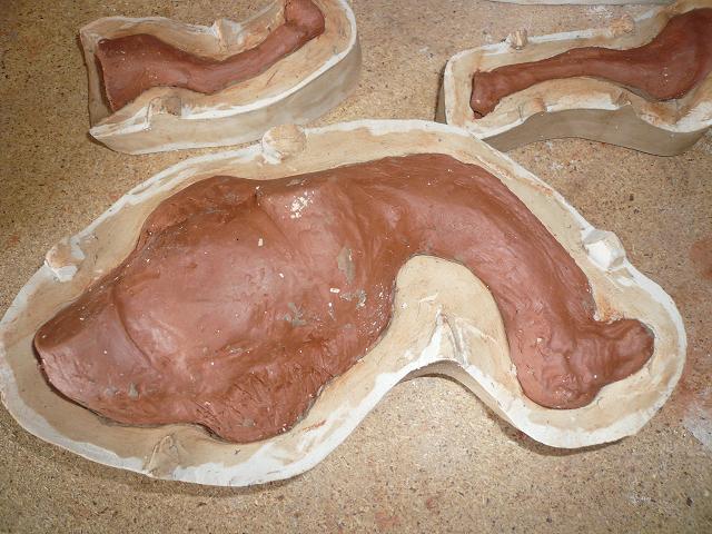 Una vez pasado el tiempo necesario, abrir el molde con cuidado, se suele meter una espátula por medio dando uin golpe seco y desunir con cuidado. Abrirlo, quitar la pieza original y limpiar el interior del molde y dejar secar bien. Una vez seco, llenar cada mitad del molde con barro fresco, untar con barbotina cada parte y unir fuertemente las dos piezas del molde, dejarlo un buen rato y separar las piezas del molde, si podeis sacar la pieza de la parte interior del molde la sacais y si veis que se resiste esperar un rato que se endurezca la pieza. El tiempo que esté la pieza dentro del molde irá encogiendo lentamente y será mas facil sacarla. Puede que el molde no esté muy bien echo y se estropée algo la pieza, pero como esta fresca la retocas o arreglamos, eso será ya la práctica la que os dé la experiencia y corrección de defectos.