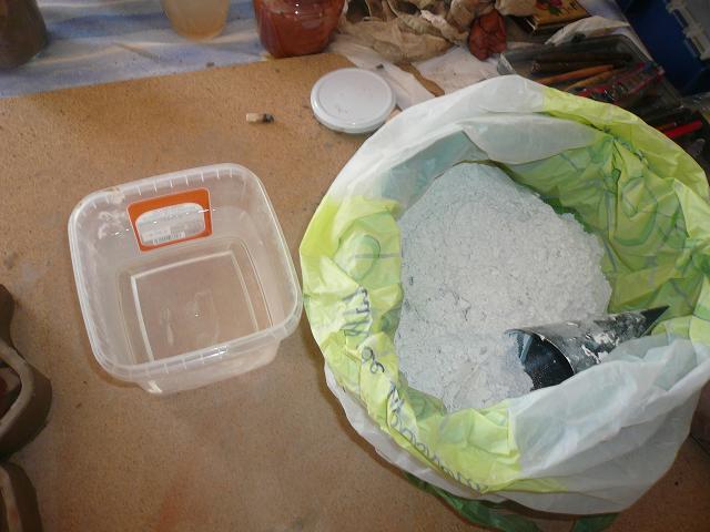 Una vez efectuado esto y teniendo cuidado de que la escayolano no salga por las juntas de la base con la pared realizadda hacemos la escayola de la siguiente forma. en un recipiente ponemos la cantidad necesaria de agua y poco a poco vamos esparciendo la escayola, nunca de golpe, poco a poco hasta que nos quede en la parte superior un poco de escayola sin cubrir y dejamos reposar un tiempo, podeis encender un cigarro y fumar al menos la mitad. No meter la mano en ese tiempo. Una vez pasado ese tiempo podeis meter la mano, espatula o lo creais necesario para moverla despacio, procurando no hacer burbujas y si quereis, antes de dejarla caer el la caja del molde, podeis golpear un poco la mesa para que salgan las burbujas arriba.
