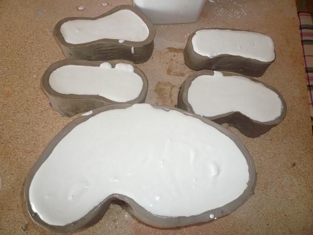 Antes de depositar la escayola untamos toda la figura y la base de la primera parte de escayola con barbotina para que no se pegue la segunda parte del molde sobre la primera. El mejor desmoldeante para la escayola es el barro diluido con agua y para esta operacion deb ser muy clarito, o sea muy aguado.