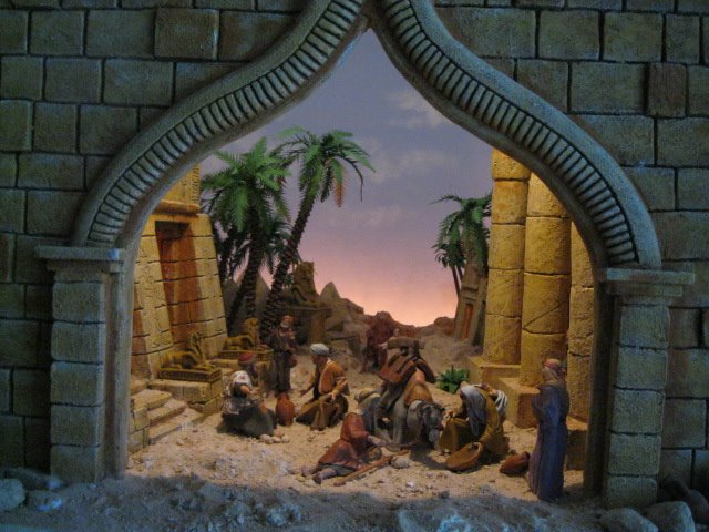 me preguntaba donde estaba el niño, pense que quizas lo estaban bañando a las orillas del nilo....jejejeje...... y es ahora cuando me doy cuenta que lo tiene maria en la espalda (si es que mi vista no me falla otra vez).....vaya que ingenio la del autor, me encantan las posturas naturales y normales....maria postrada con cara de fastiga despues del parto, un rey sentado dandose masajes en los pies por cansacio, el niño jesus totalmente desnudo, que se vea la teta de maria cuando lo amamanta, jose cargado el niño, etc...creo que hacen de los nacimientos que sean mas humanos como debio de suceder
