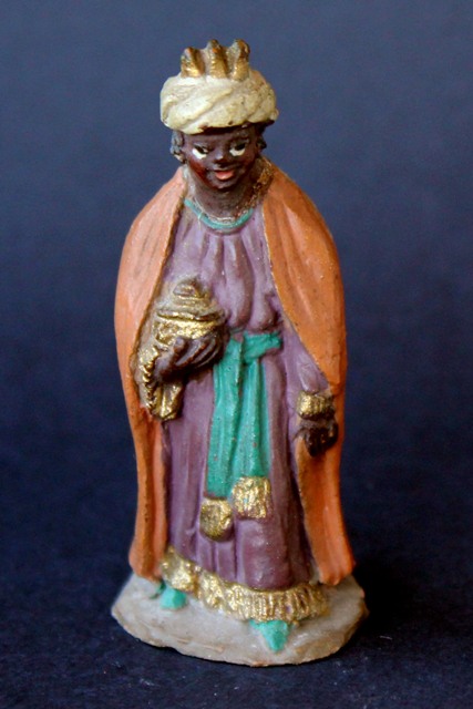 Podeis consultar en la web www.caganer.com en el apartado figuras de barro (figures de fang) de 5 cm. hay unos reyes prácticamente iguales, tan solo hay una pequeña variación en la capa y el turbante del rey negro.