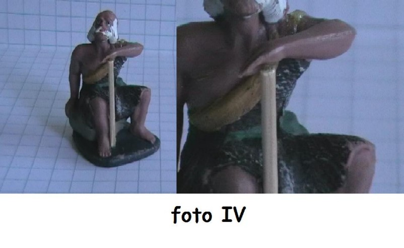 foto IV: una vez seca la unión del brazo, tantear la medida del bastón, trasladarla a un palillo de dientes, y éste pegarlo a la peana y a la mano de la figura, con pegamento de contacto.