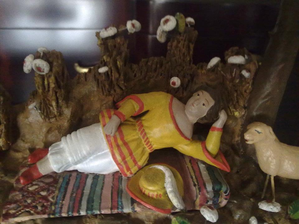 Estimados belenistas: Abusando de vuestros conocimientos me gustaria saber mas sobre esta figura que ha pasado de generacion en generacion hasta la fecha y que recientemente me han restaurado. Solo se que formo parte de una gran coleccion de figuras, todas ellas de identica indumentaria, que pertenecio a una familia muy antigua de mi pueblo. Parece el tipico pastor dormido obligatorio en todo Belen Napolitano que se precie, pero resulta aventurado para un profano como yo en la materia, asi que espero vuestras sugerencias. Agradeciendo de antemano vuestra colaboracion, recibid un fuerte abrazo belenista.