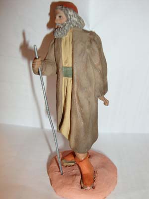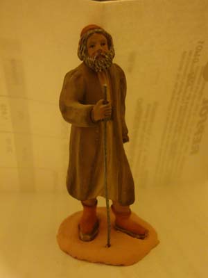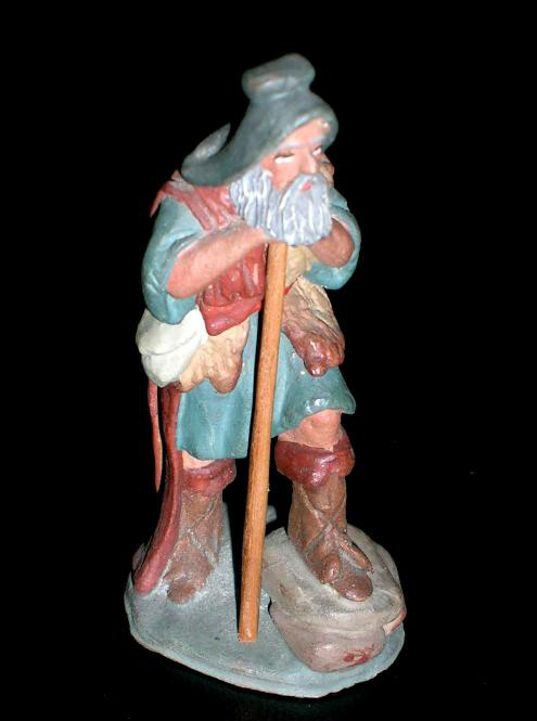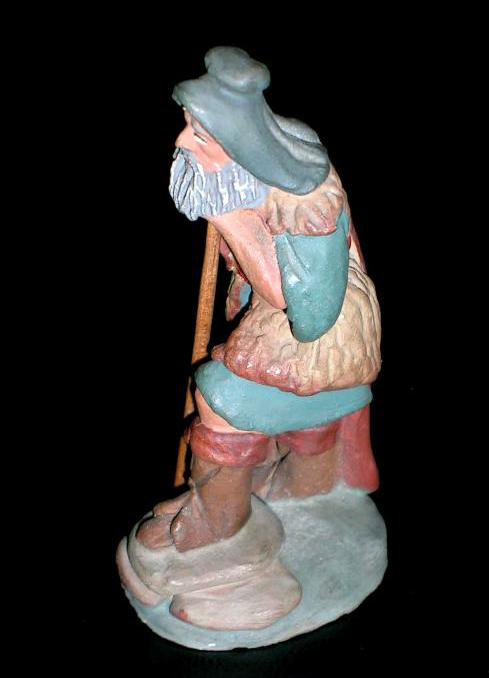 Bueno la verdad es que es una figura que me descoloca bastante, se me paso hacer una foto al otro pastor de castells, que tiene la misma cara, se trata del pastor joven con turbante, con una rodilla en tierra y que suele tener una gallina, este no la tiene, claramente es original de los castells ya que la pelliza que lleva es esta de bultitos que tan mal se reproduce en las imitaciones.