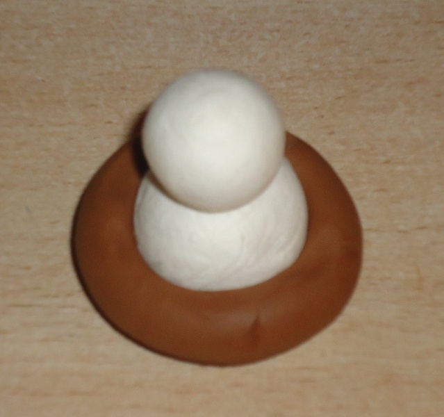 Se hace una bola de porcelana más grande,como más o menos la bolita grande y la pequeña juntas y se hace una pelotita uniforme,ahora hay que forrar las dos de manera que queden separadas sólamente por el lado de las jorobas,intentando hacerlo de forma que no quede aire entre las bolitas y la porcelana.Cuando están forradas se pasa un pañito húmedo y se quitan las imperfecciones o arrugas que se puedan haber quedado.