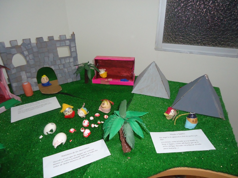 madre mia, ademas, para hacer cosas asi, con niños tan chicos, hay que tener espiritu, yo no hubiera sido capaz ni de pensarlo, de verdad... que muerte por dios! yo no soy muy niñero, y me hubieran sacado de los nervios jajaja, asiq ue doble felicitación. olle, una propuesta: para otro año, podeis utilizar huevos de codorniz para hacer a los niños. el unico problema que tiene es que el casacarón es un poquito duro, pero igual le encontrais el truco a vaciarlos y podeis hacer al niño jesus, angelitos, niños pastores... jejeje. incluso algun animal en version huevo puede colar y todo.