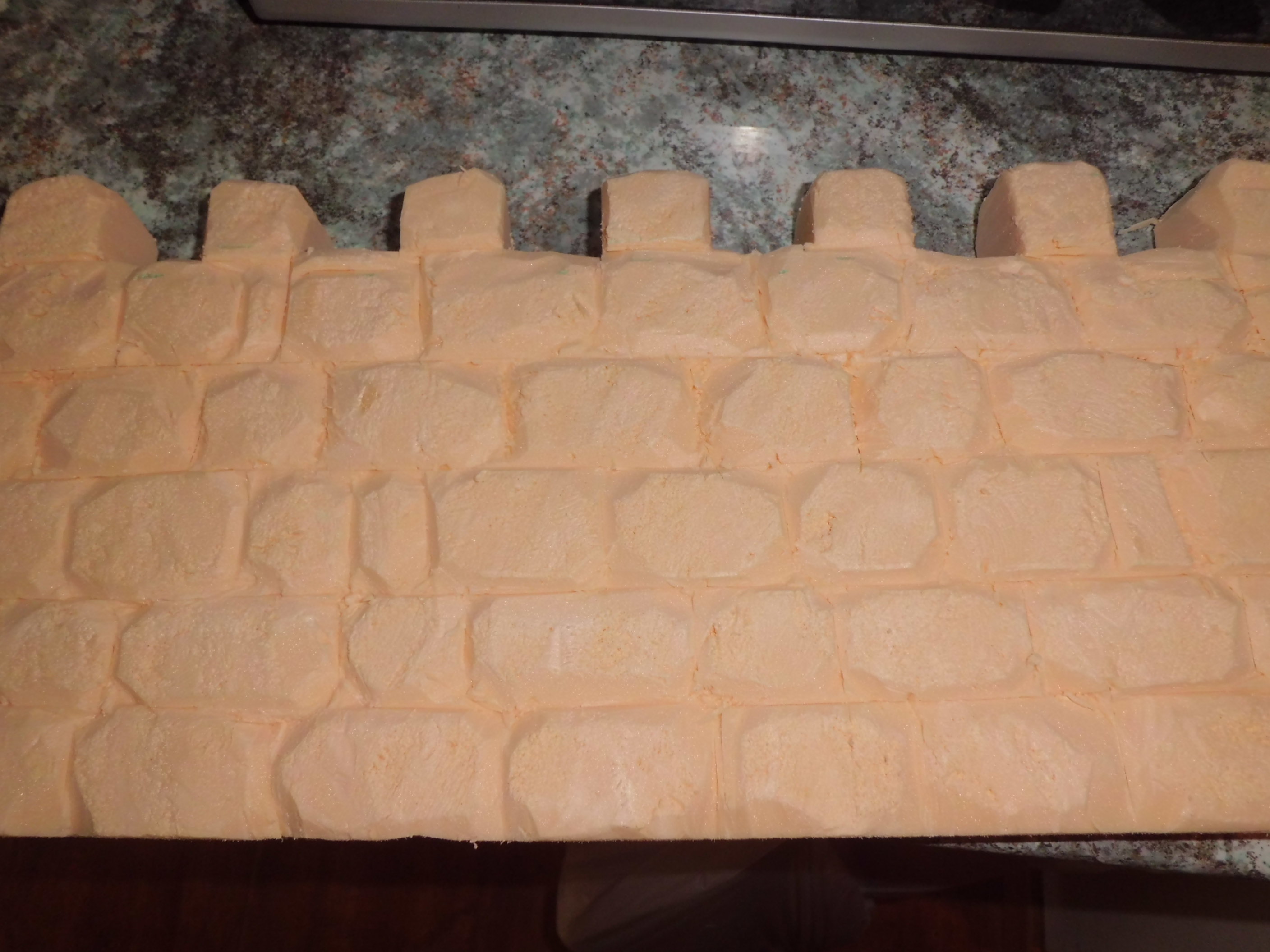 Primero, pintamos toda la muralla con un color MARRÓN OSCURO. Que no sea negro, pero tampoco que sea un marron normal... Con este color pintamos todo, dejalo un poco líquido para que entre bien en las grietas y huecos.