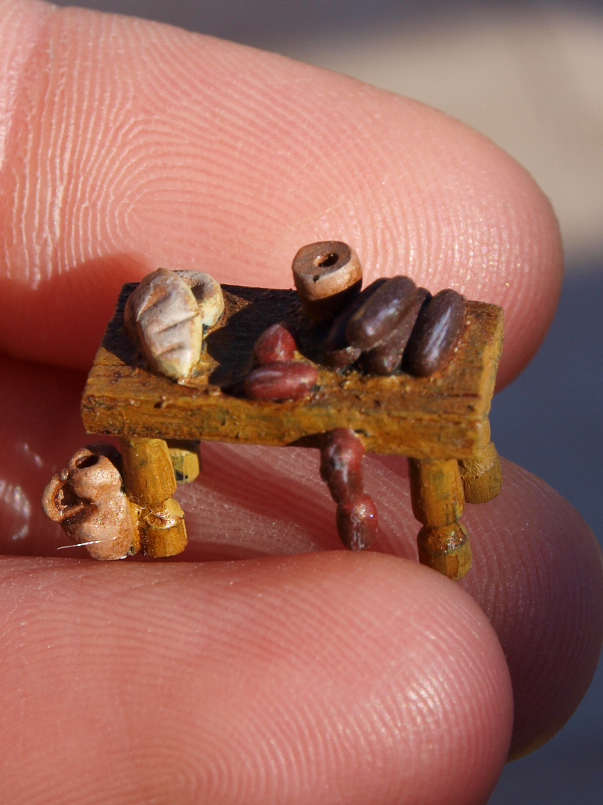 Aquí os dejo algunas fotos. Os cuento que las figuritas las volví a pintar, las vasijas, comida, mobiliario... están hechos a mano con Fimo, apenas miden milímetros. El portal, el puente, el pozo.. también están hechos así, con el mismo material. Ése es el principal inconveniente de este tamaño, no hay nada para completar la escenografía, así que voy poquito a poquito... nunca mejor dicho.