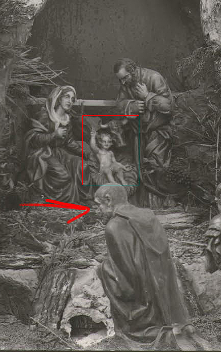También puede ser una `referencia o cita romántica´ al precursor de la representación del Nacimiento, al tambien Santo San Francisco de Asís el patrón de los belenistas construyendo en belén el pesebre a la vez que está orando( representación dentro de otra), en ese momento esta distraído realizando la obra...