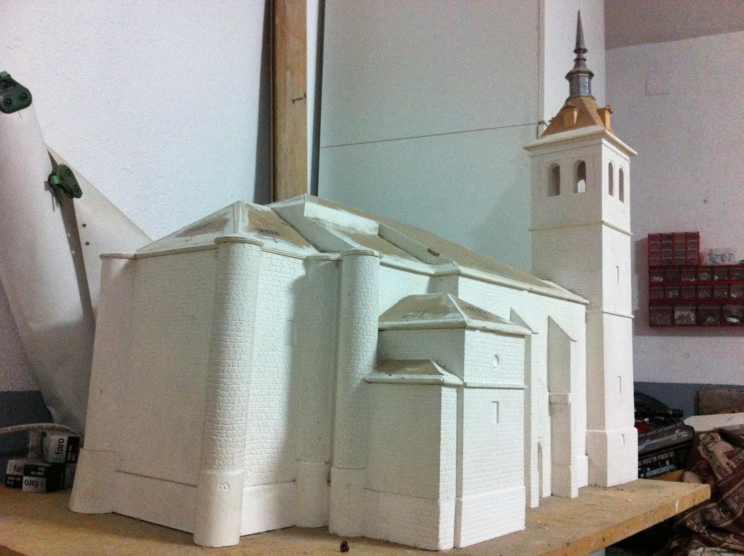 Construcción de la Iglesia de mi pueblo Colmenar de Oreja ( madrid ), realizada en escayola y aun en proceso de terminarla, como no tengo mucha experiencia y para mi lo peor es la pintura me gustaria me dieran consejos de como pintarla la piedra es imitación a la piedra caliza de Colmenar, un saludo y gracias.