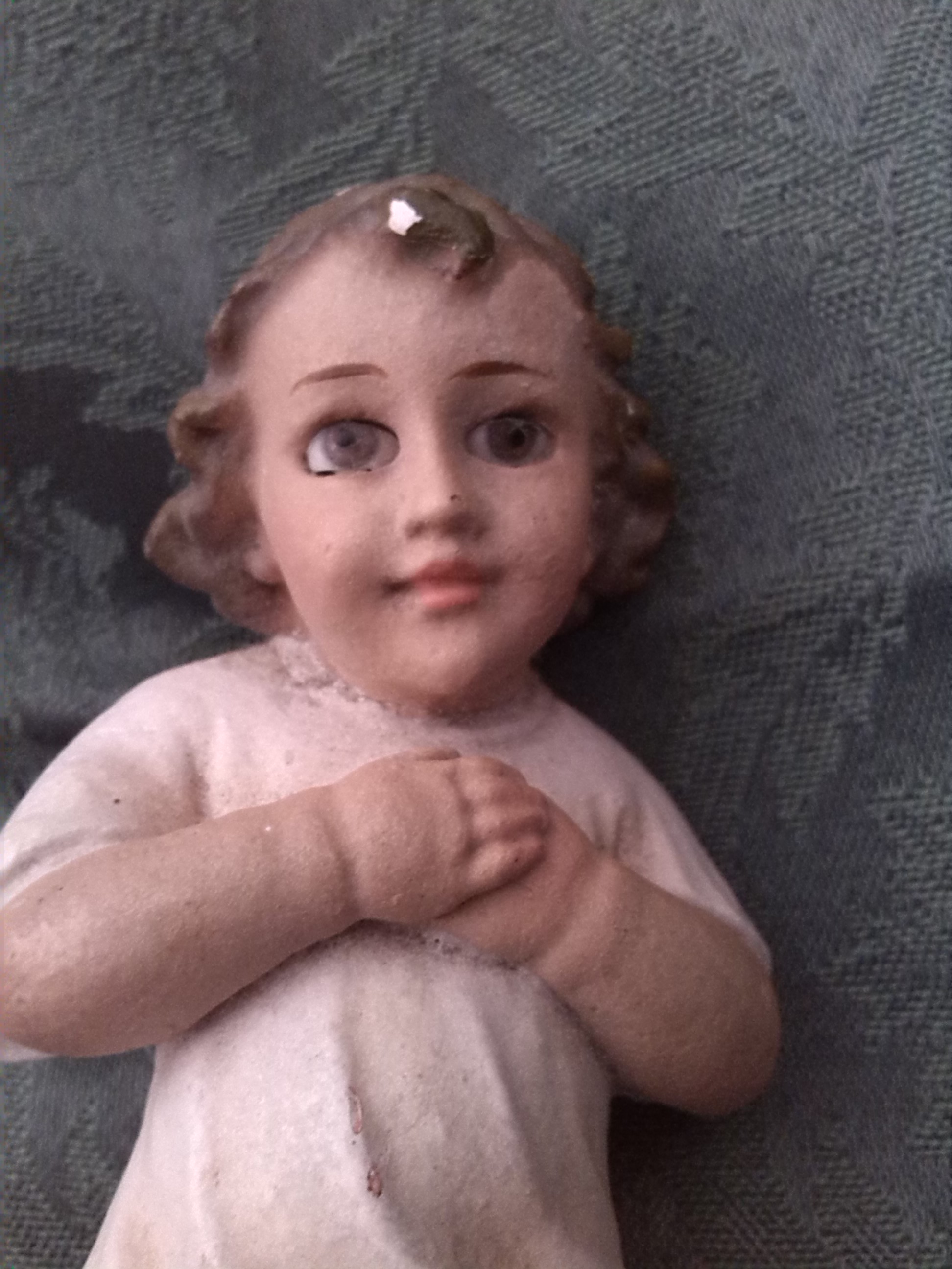 Recuerdo que mi madre me dijo una vez que ese niño perteneció a mi bisabuela, que lo trajo de Lorca. Ha sobrevivido a 4 generaciones, mi bisabuela, mi abuela, mi madre y ahora yo. Ha pasado por una guerra, incendios, mudanzas, golpes...pero aun así....seguia apareciendo con esa carilla. Cuando mi madre me contó toda la historia, decidí que ya no daría mas tumbos, y lo tengo como oro en paño en una vitrina. Hoy he decidido sacarlo y mostraroslo. No le he querido tocar nada, asi que se pueden apreciar esconchones, un pie quemado...pero sigue teniendo esa esencia, esa carilla que recuerdo desde que era pequeño. No se nada de su autoría, ni el material, ni si es bueno o no, tan solo me quedo con el cariño de haber pasado por cuatro generaciones, y por estar siempre ahi con esa carilla. No lo he podido poner nunca en el belén, puesto que mis figuras son de 21 cm y se queda algo descompensado, ya que mide 11 cm. Espero que os guste y os trasmita esa ternura que desde pequeño siempre me ha trasmitido. Un saludo.