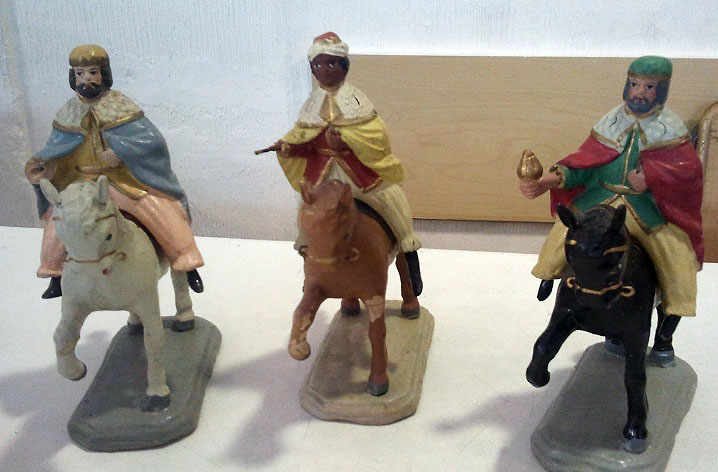 Normalmente a todas la piezas a la venta las ponemos procedencia y fecha aproximada de creación, asi que os agradeceria si alguno conoce de donde podrian ser estas figuritas y de que año aproximado. En todocoleccion he visto los reyes unos reyes a caballo iguales pero no ponian de donde son ni epoca.