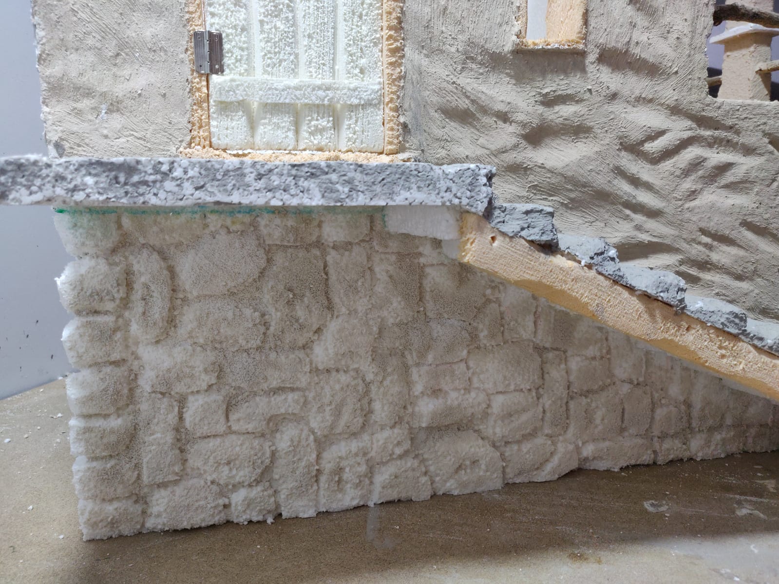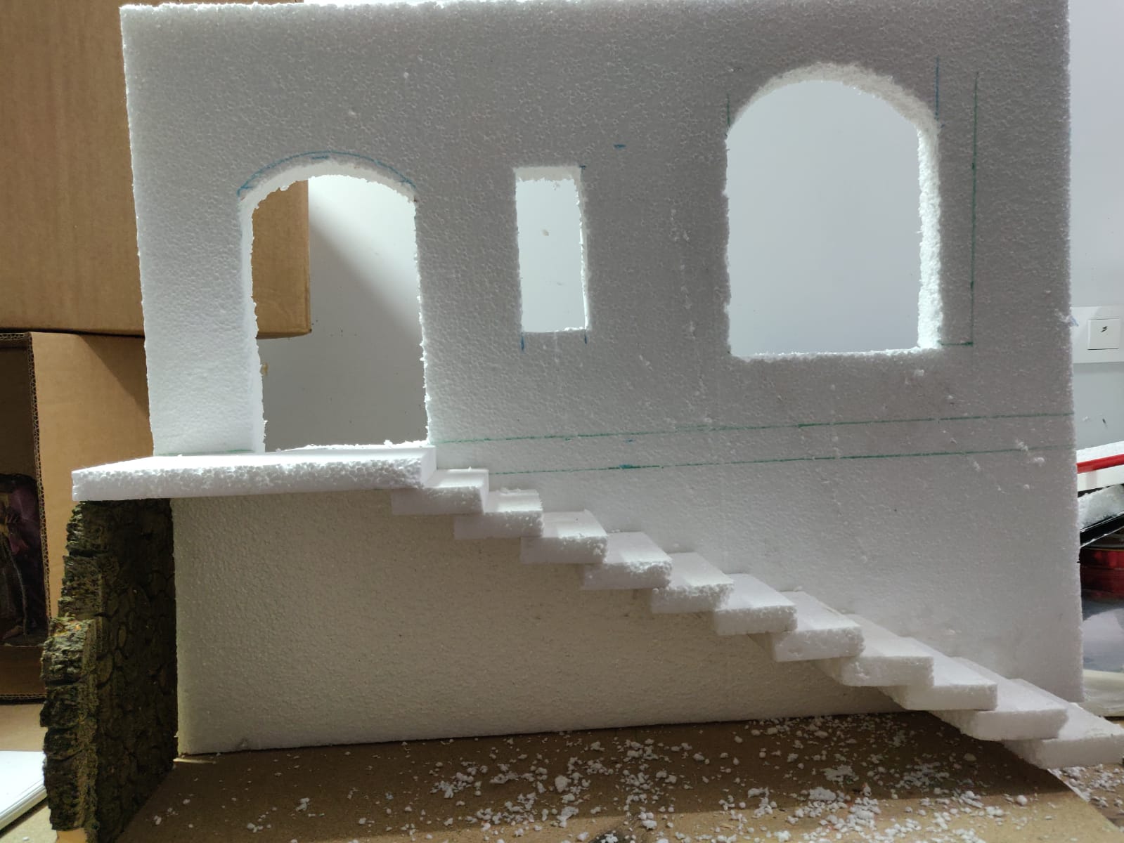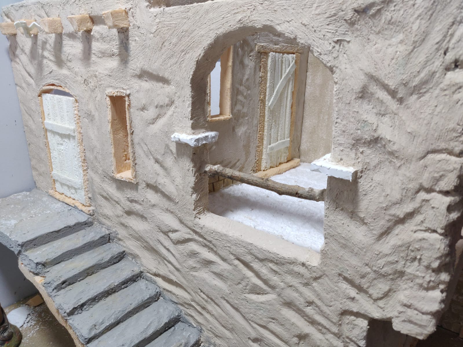 Buenas tardes foreros. Después de algún tiempo sin hacer nada, este año me ha tocado preparar el Belén de nuestra Parroquia. Para ello, tengo que preparar un Portal y distintas edificaciones. Para la primera vivienda, he pensado en una edificación que tenga en si tres y por la parte de atrás un corral. Consta de dos plantas y para ello he utilizado poliespan (el de bolitas). He realizado unas hendiduras en la fachada con el soldador y ayudándome también del cuter para quitar las lineas rectas a las piedras que asoman en la fachada. Para dar textura y a la vez color a la fachada he utilizado mortero monocapa de la marca Puma y de color crema. Tengo que añadir que está hecho para figuras de primer plano de 21 cm.