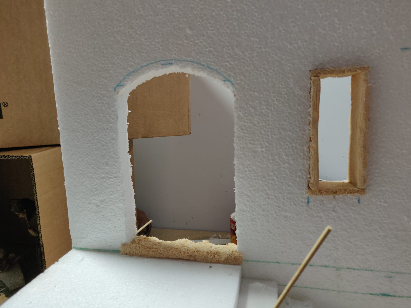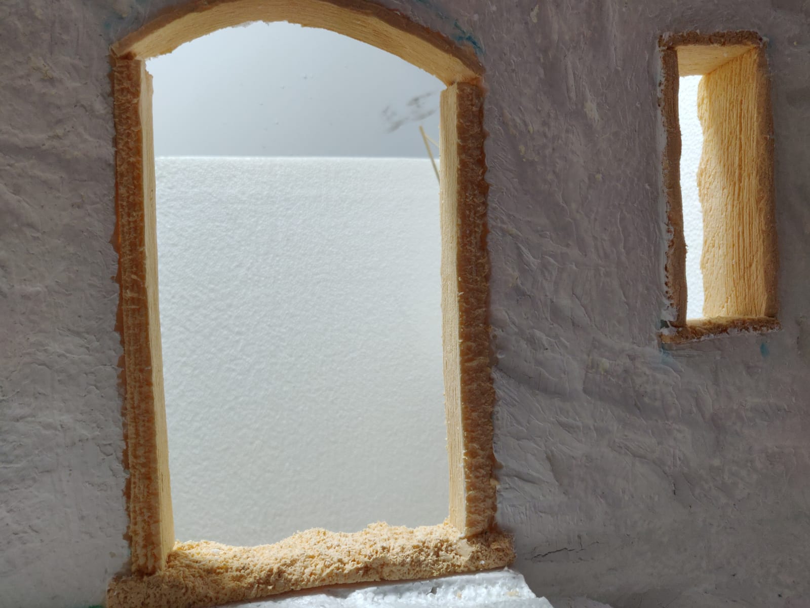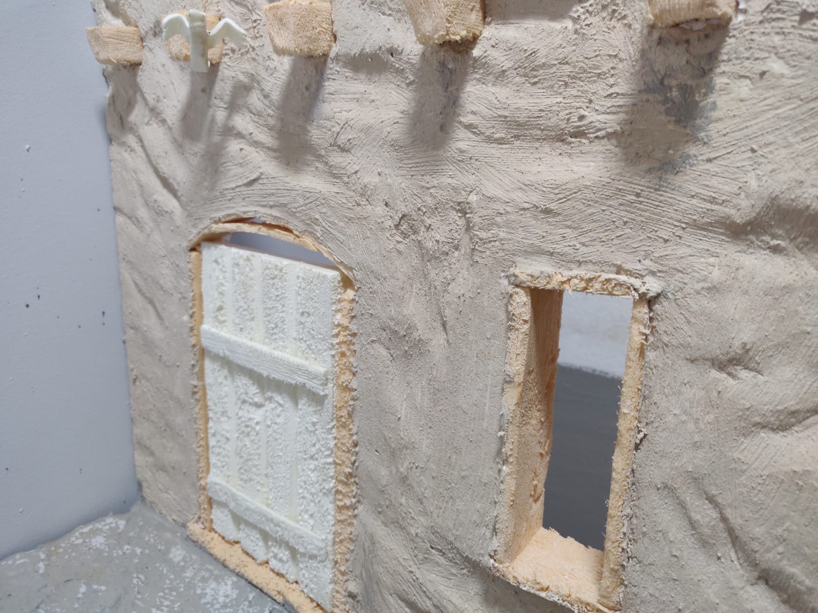 Buenas tardes foreros. Después de algún tiempo sin hacer nada, este año me ha tocado preparar el Belén de nuestra Parroquia. Para ello, tengo que preparar un Portal y distintas edificaciones. Para la primera vivienda, he pensado en una edificación que tenga en si tres y por la parte de atrás un corral. Consta de dos plantas y para ello he utilizado poliespan (el de bolitas). He realizado unas hendiduras en la fachada con el soldador y ayudándome también del cuter para quitar las lineas rectas a las piedras que asoman en la fachada. Para dar textura y a la vez color a la fachada he utilizado mortero monocapa de la marca Puma y de color crema. Tengo que añadir que está hecho para figuras de primer plano de 21 cm.