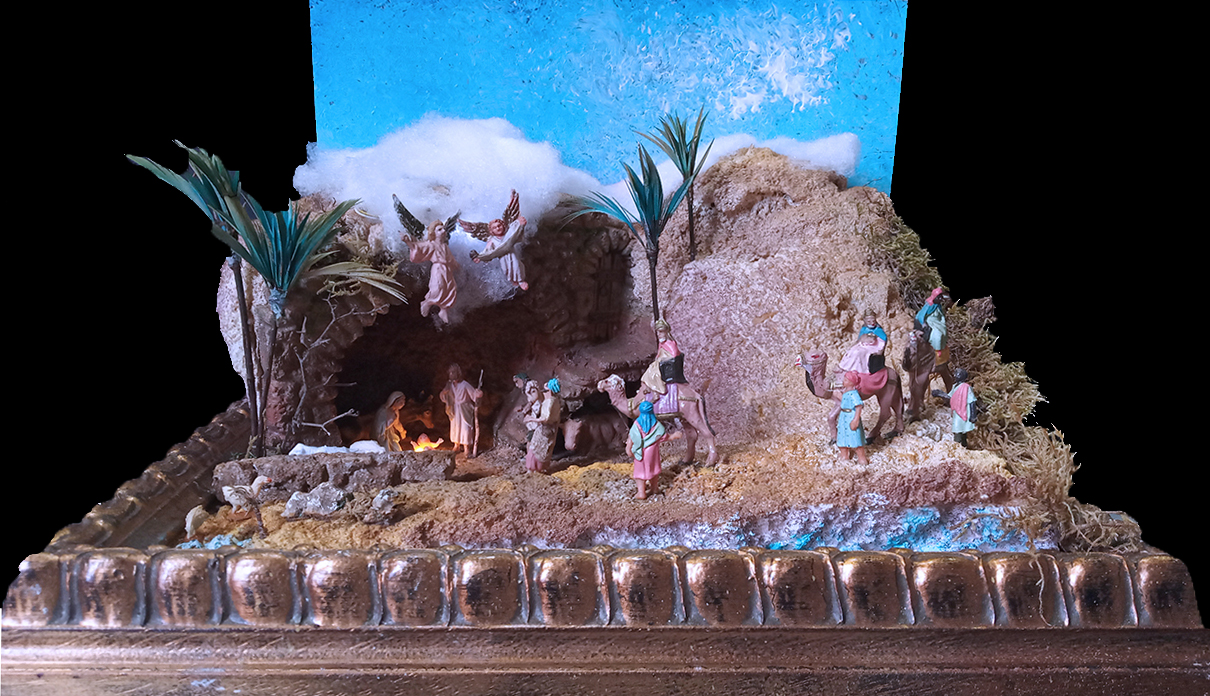 La iluminación para recrearla, utilicé leds, para la niebla de los ángeles tres de luz blanca y dos rojas y para el niño Jesús una cálida.