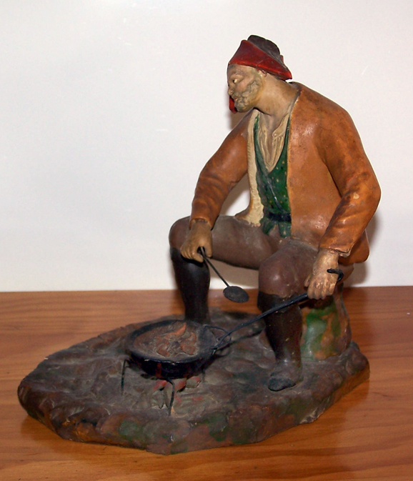 En cuanto a las otras dos figuras, ay, es muy difícil adjudicar autorías si no son de los escultores más "clásicos". El "gachero" no es catalán a mi entender, lo que lleva no es una "barretina" sino un bicornio con la vuelta de color rojo. Como Antoni, coincido en pensar que son de escuela murciana... y no la tengo demasiado ubicada.