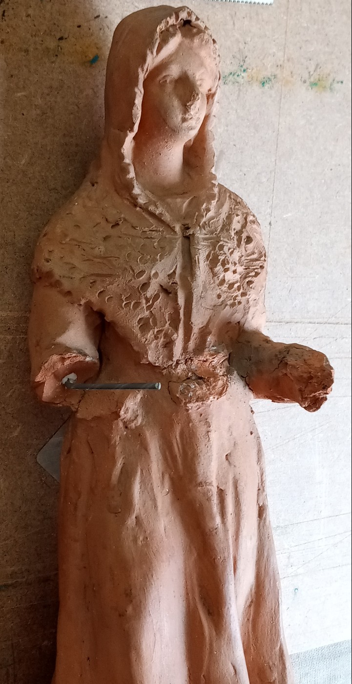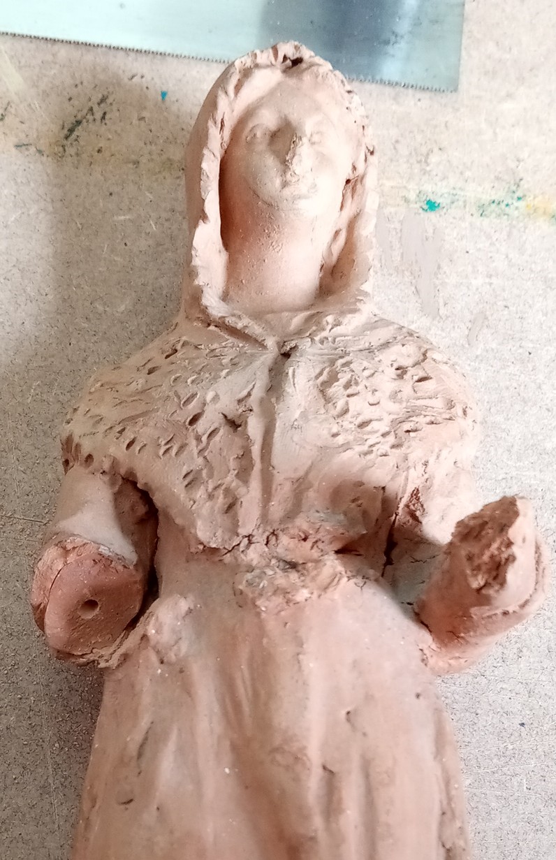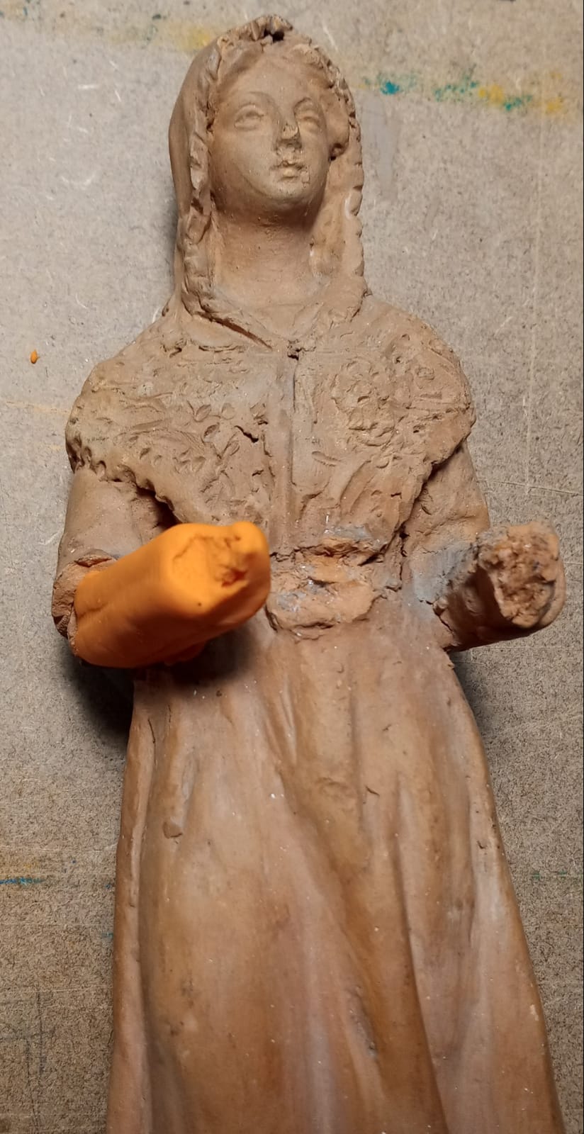 Ya modeladas la figurita de la Virgen, la bandeja y las partes que faltan del brazo y las manos y ajustadas a la figura,