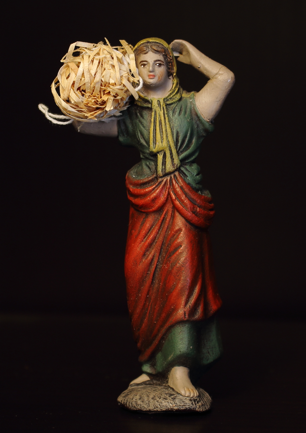 Pastora de camino con fardo de paja (tiene sendas roturas en el brazo y la mano izquierdos, están pegadas, se nota un poco, ver fotos), 11cm. - 18 €