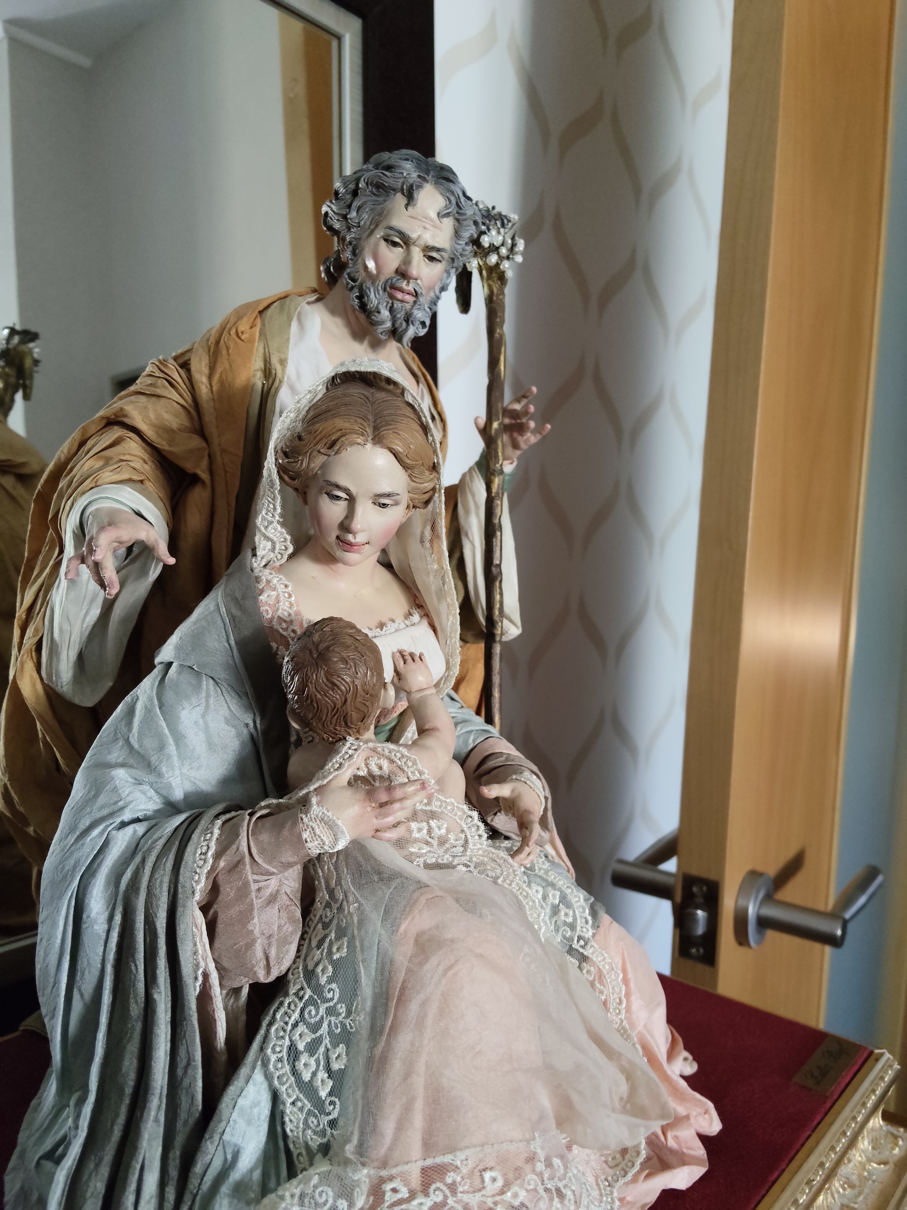 En venta magnífico Belén de estilo Napolitano de 35 cm., obra de la prestigiosa artista Lilia Bryl. El mismo se encuentra en perfecto estado, se compone de San José, la Virgen María y el niño Jesús, todos ellos sobre una peana tapizada en terciopelo rojo y canteada por una moldura dorada.