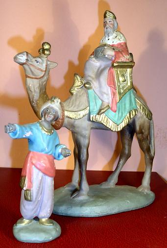 Estos Reyes Magos son tb de un "brocante" que vende fundamentalmente libros y revistas, con objetos de colección, en la calle Sepúlveda junto a la Plaza de Goya. Ya colgué unas fotos en su momento, pero he hecho otras y no resisto la tentación de colgarlas. Son figuras de molde, terracota, unos 40 años de antigüedad ¿catalanes?, 12 cm (cortos) el paje, que tiene una mano de plomo. Al final, el típico "Melchor" del Prado, recién comprado... para comparar, sí señor....